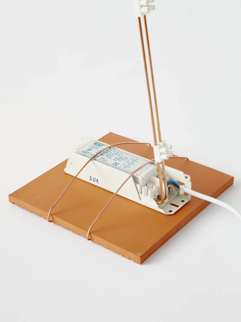B.A.R.E ‘Small Simple’ Table Lamp is a piece that forms part of the serie Brick, Appliances, Rods and Electricity (B.A.R.E). This collection of lamps is produced with bricks or tiles on the bases, from which iron rod structures and electric quick connectors grow to bring the light to the lamp. With these simple systems, Lucas Muñoz Muñoz creates lighting elements that are easy to produce and have a low cost. This is why they are manufactured by the students of the Asociación Norte Joven in their electricity module / workshop, thus adding the designer a social bias to the project.