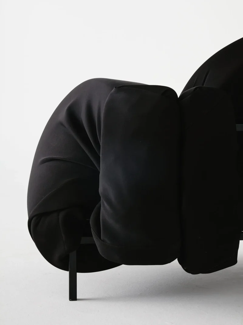 This piece is composed of two foam blocks, cut at a right angle, covered by a neoprene sleeve and tamed into a Sofa function by setting it in a steel frame. It’s a Contemporary redefinition of Upholstery where Tension and Compression shape Function. The concept of minimal intervention in the original manufactured state of the material defines design decisions throughout the piece, so no screws, glue or any other mechanic or chemical connector is used, A straight seam closes each neoprene sleeve in a tube. Foam cuts and metal welds are only done in right angle, with just the pressure to “fit in” defining the shape of the resulting Sofa.