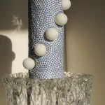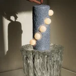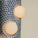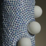 5 recessed bulbs in a diagonal spiral. Dimmable. Iridescent recycled glass tile. A happy little dude for any perch!