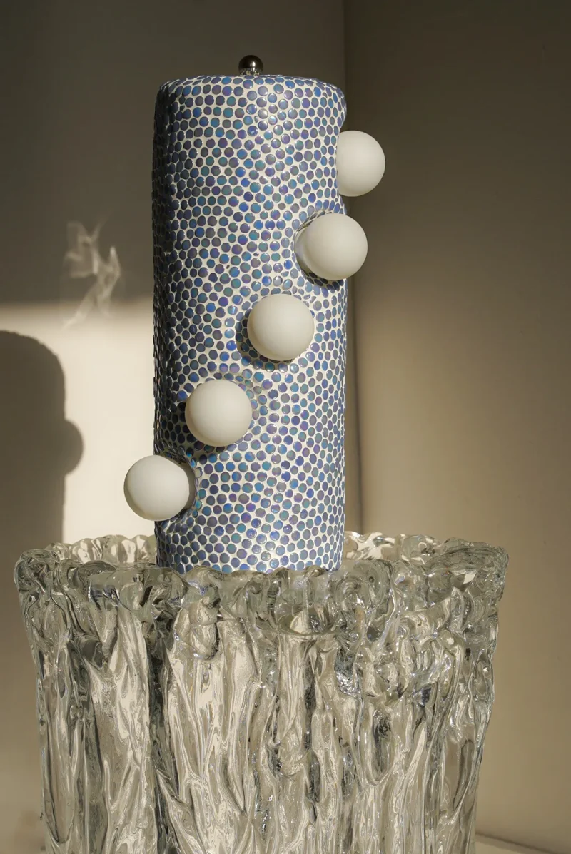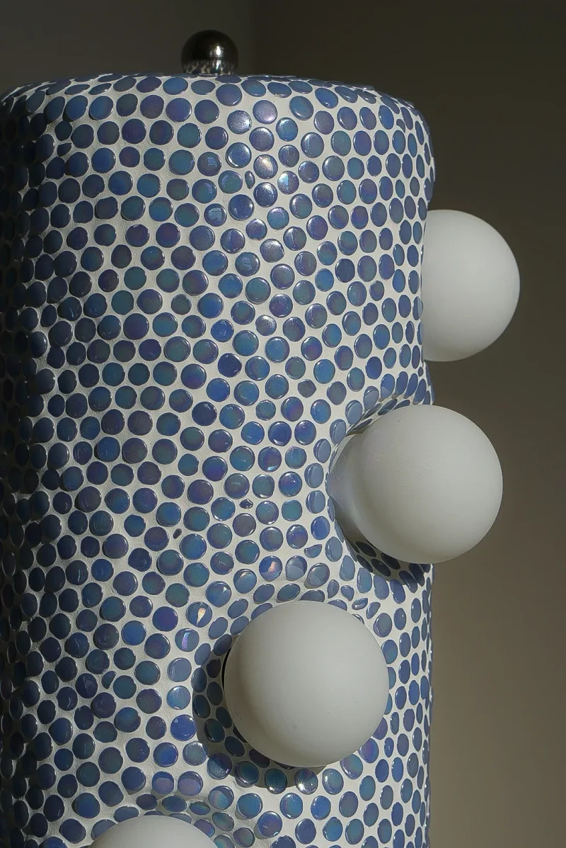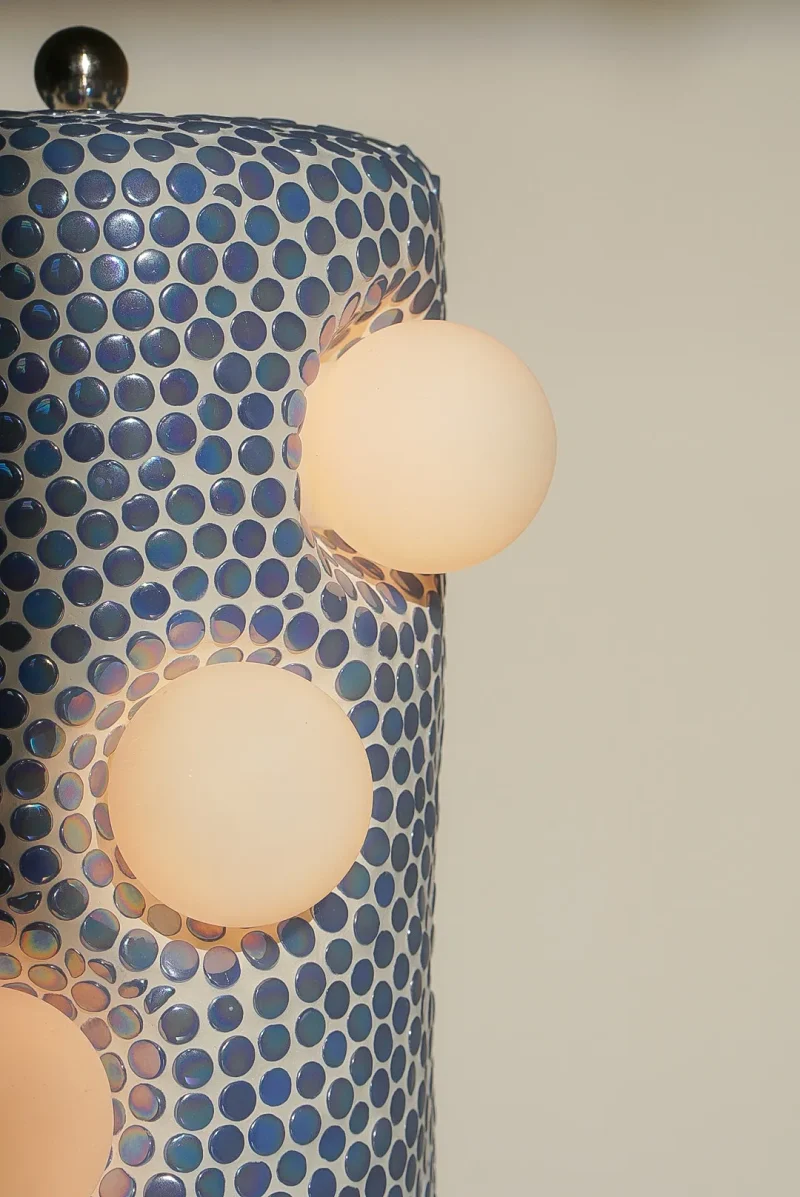 5 recessed bulbs in a diagonal spiral. Dimmable. Iridescent recycled glass tile. A happy little dude for any perch!