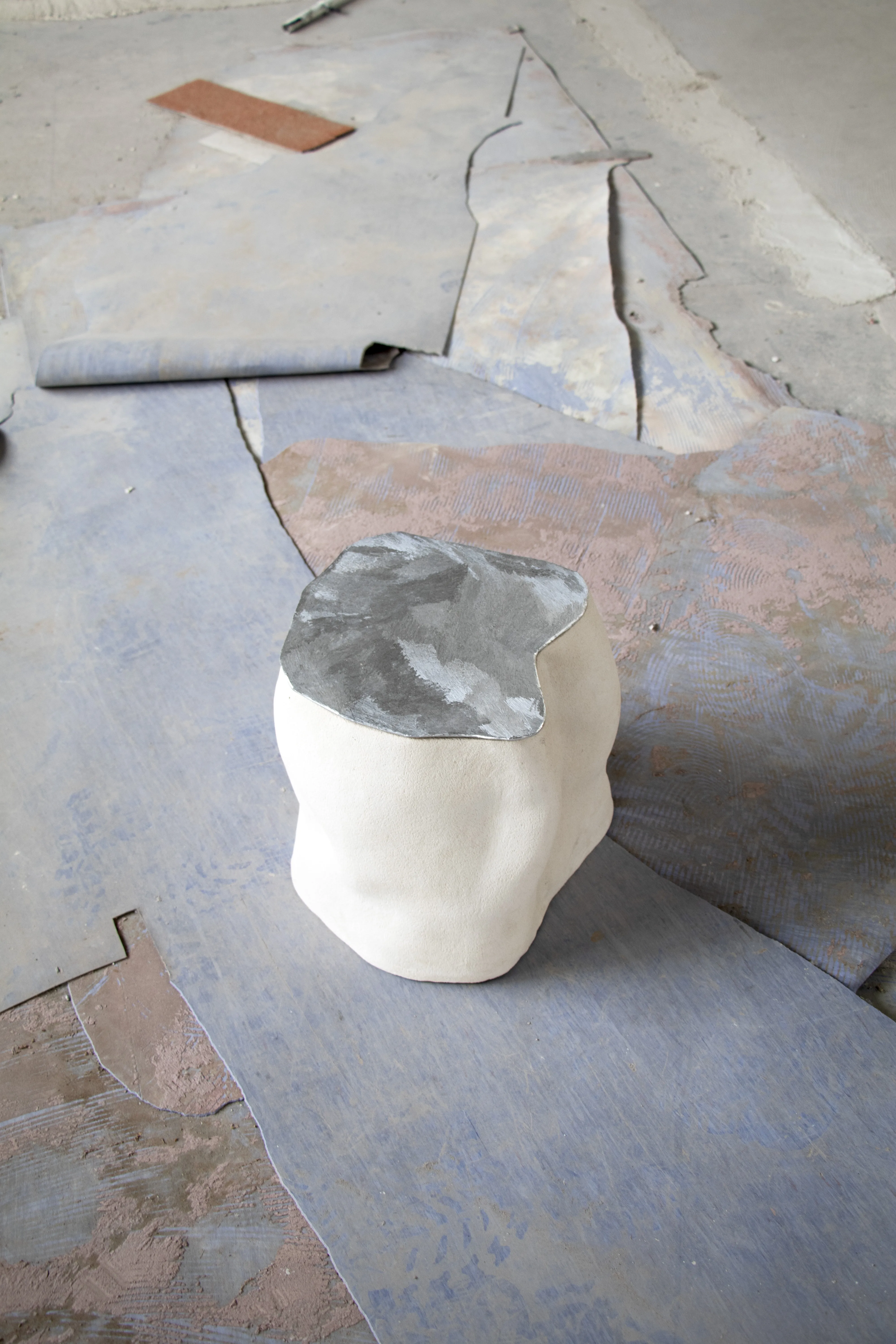 The Baie side table is entirely handcrafted, from its chamotte stoneware base to its aluminum top. A thin aluminum plate, carefully engraved line by line to create an abstract texture, rests on its organic form. The pattern changes subtly depending on the light and the viewer’s perspective.