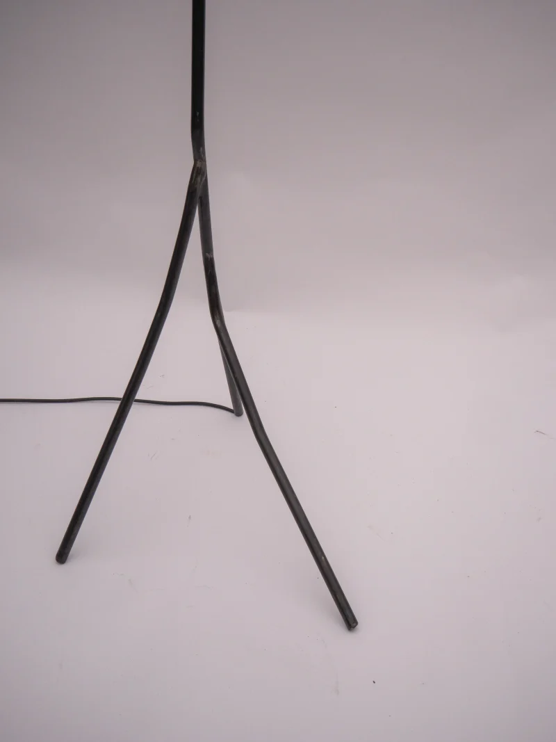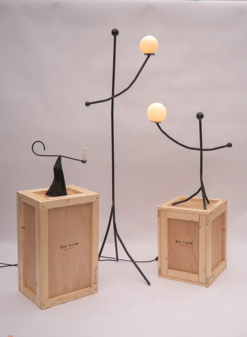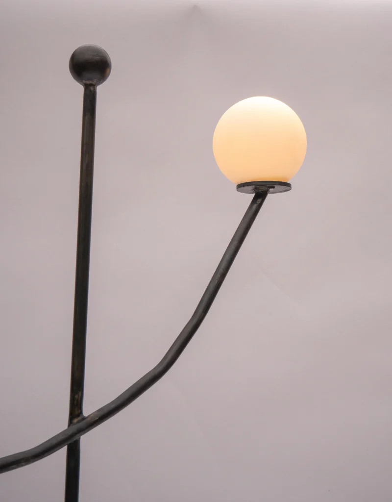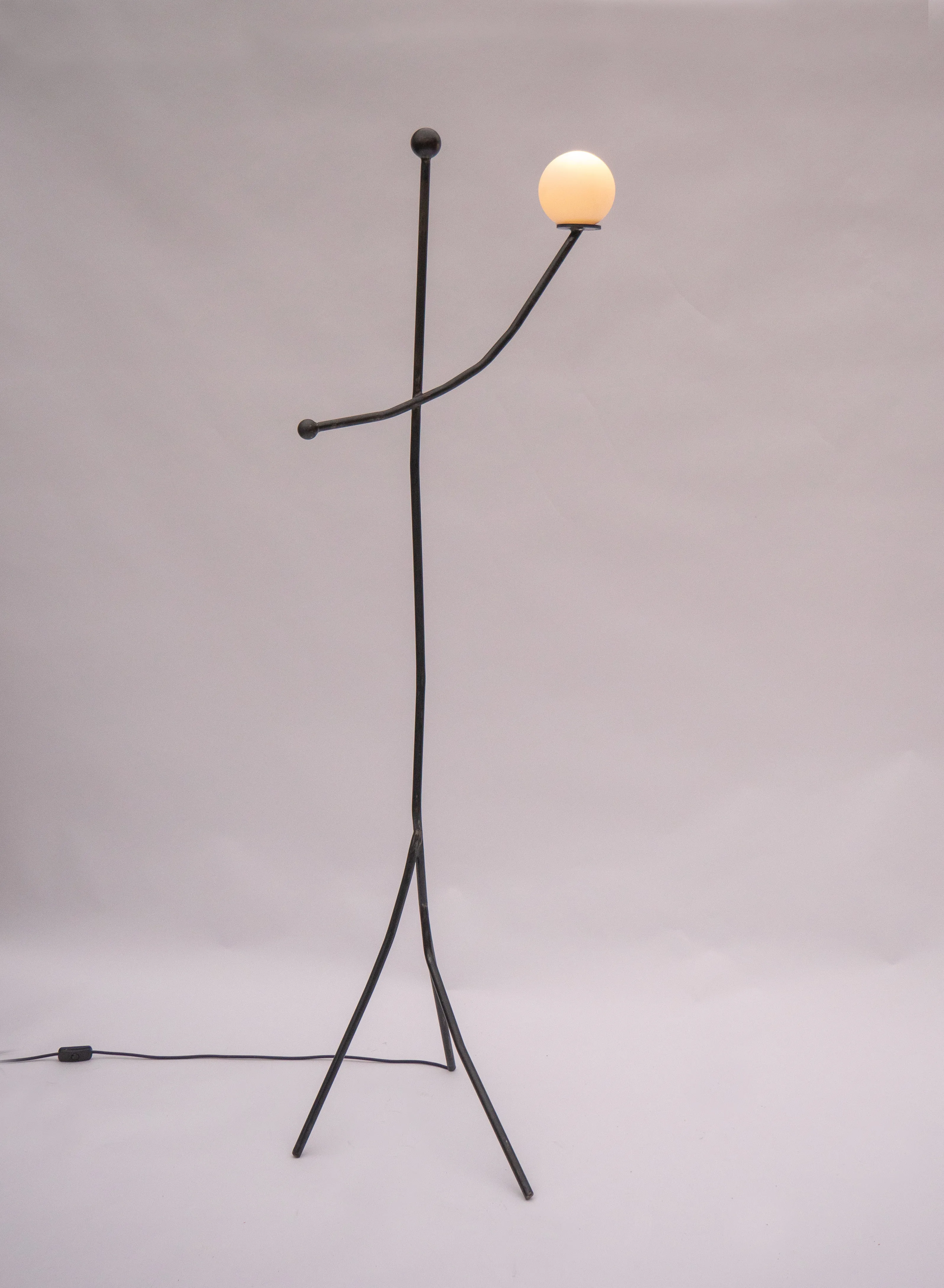 A welded Steel Floor Lamp. Balancing Act is a collection of two lamps and a candle holder. Inspired by Calder’s Circus, it captures a sense of naive joy and playful freedom, inviting interaction and spontaneity through balanced forms and whimsical design.