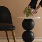 With its veined marble top and wooden legs, our Ball Pack Table, crafted from a single piece of wood, blurs the lines between sculpture and functionality. Ideal to keep a mug or cellphone next to a tight seating!