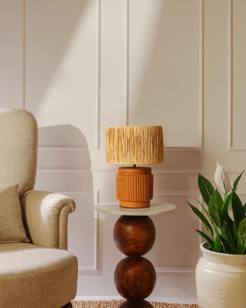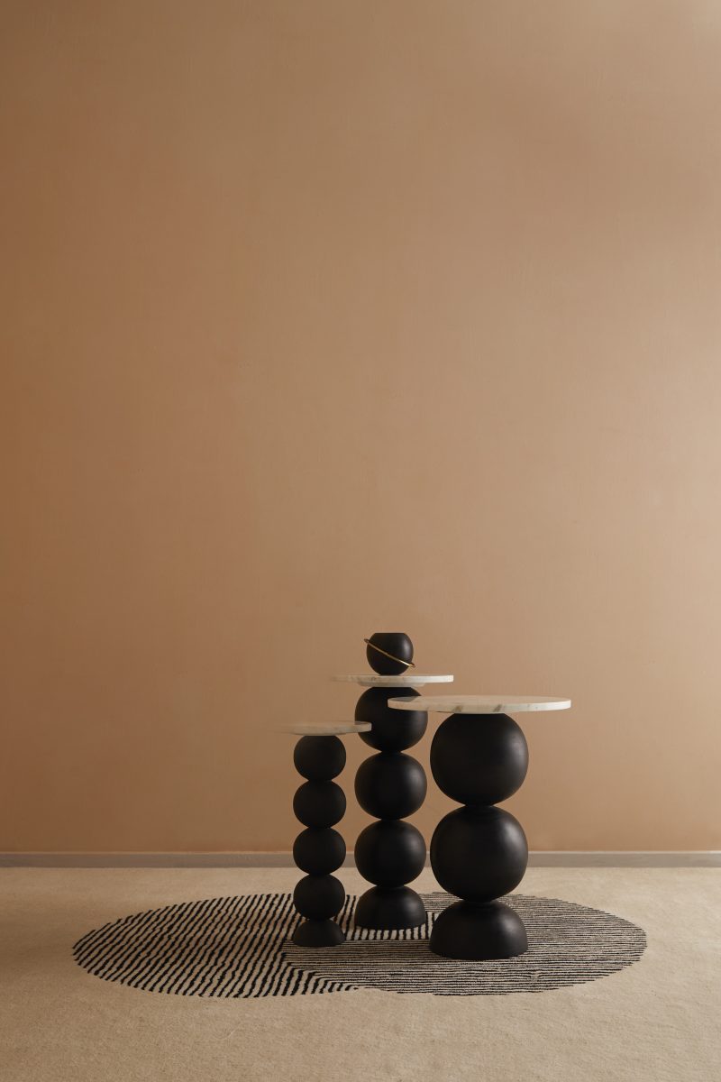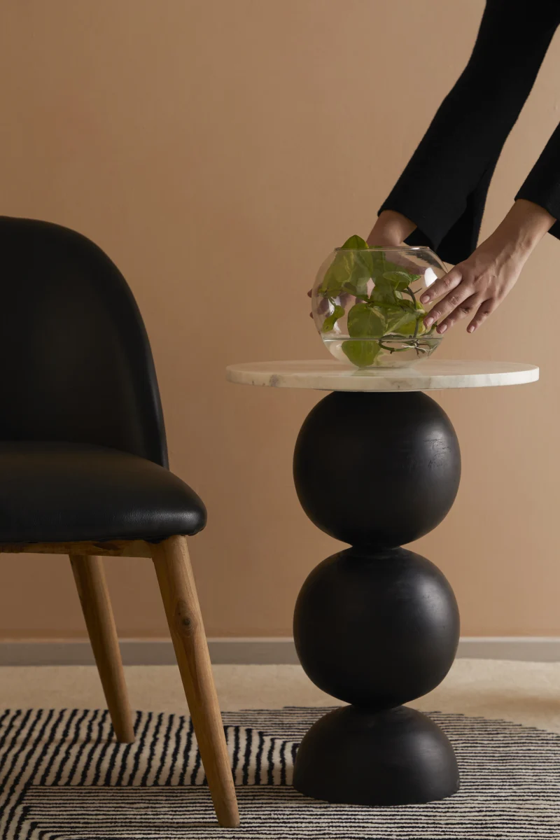 With its veined marble top and wooden legs, our Ball Pack Table, crafted from a single piece of wood, blurs the lines between sculpture and functionality. Ideal to keep a mug or cellphone next to a tight seating!