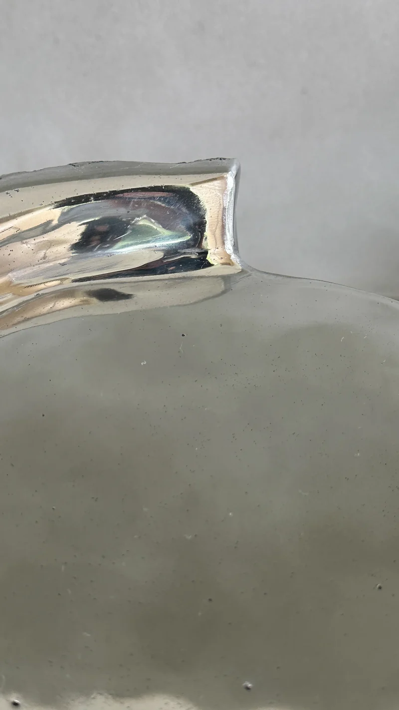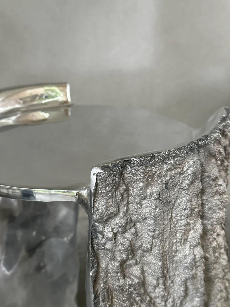Each unique ripple and pit, formed through the hand-casting process, adds to the piece’s individuality. Over time, the surface will naturally develop a patina, deepening its character. Alternatively, it can be restored to its original brilliance with a simple polish, offering two distinct expressions of its evolving form.