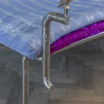 Echoing the industrial rigidity of barricades, the daybed’s curved legs mimic their handles while the linear frame preserves their stark, utilitarian essence. This version features a singular backrest, creating a dynamic contrast between its shorter seating area and taller back, reinforcing the interplay between protection and exposure.