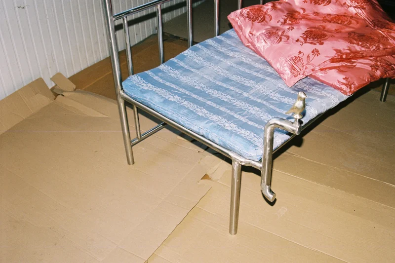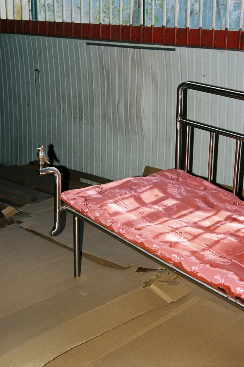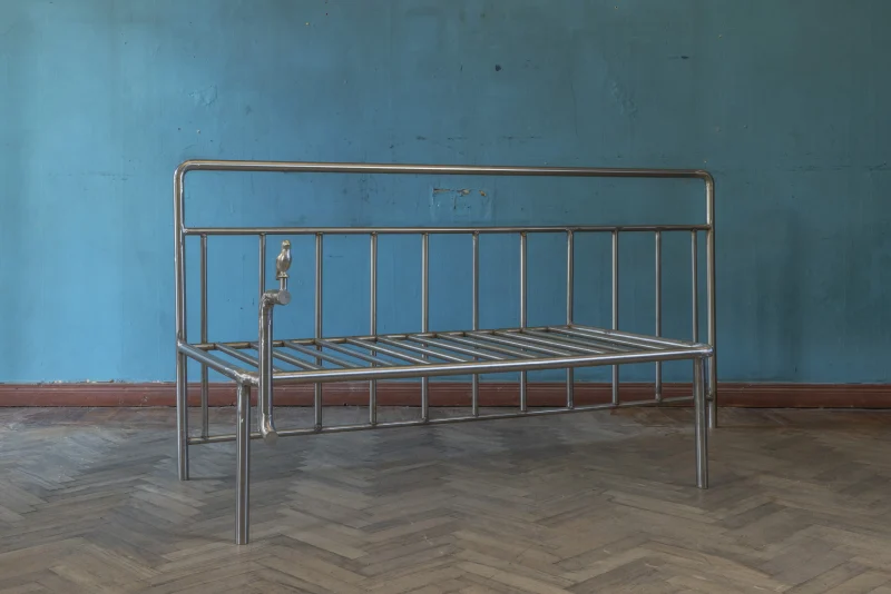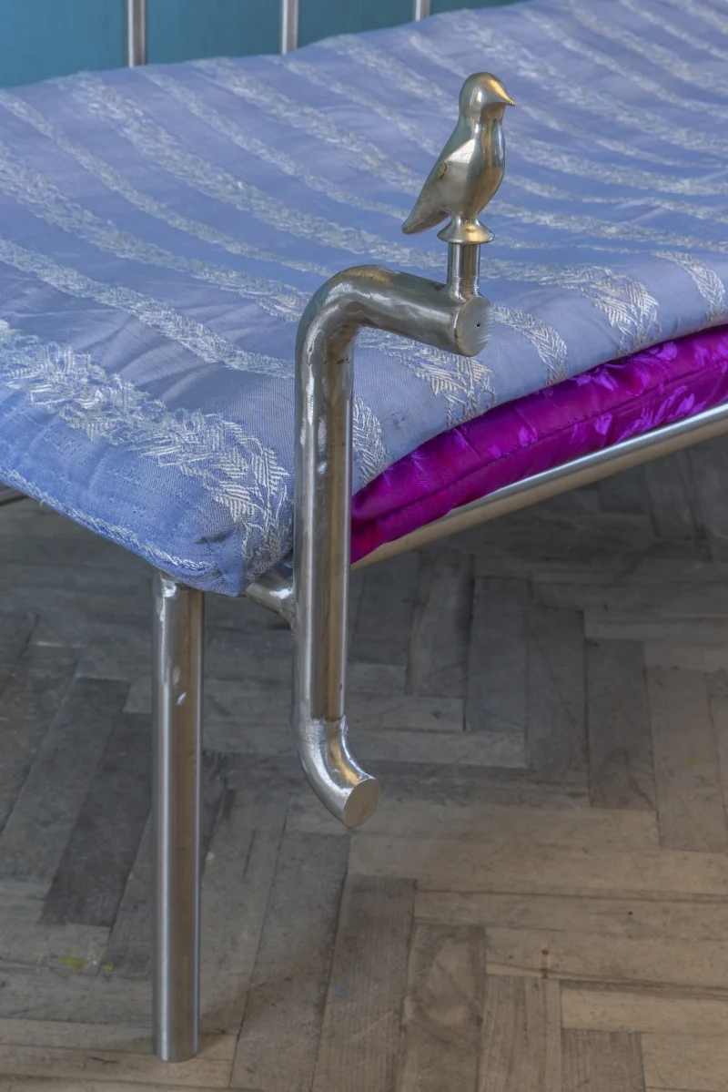 A small silver-covered bird sculpture, delicately perched on the handle, introduces a poetic contrast—softening the rigid metal with a symbol of fragility and freedom. Through this juxtaposition, the Barricade Daybed No. 2 becomes more than furniture; it is a reflection on space, power, and resilience, blurring the boundary between design and sociopolitical commentary.