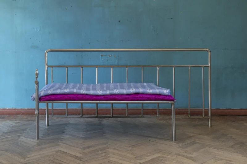This bed comes with mattresses in different colors. Each mattress is made from found fabric, making every piece unique.