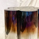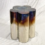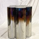 Shaped like five petals, the stainless steel table features a gradient blue hue running down the base, achieved through heat treatment. This process was central to our material experimentation, as we explored various firing techniques to understand how heat transforms steel.