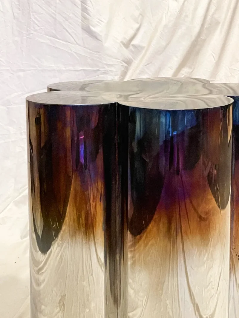 Shaped like five petals, the stainless steel table features a gradient blue hue running down the base, achieved through heat treatment. This process was central to our material experimentation, as we explored various firing techniques to understand how heat transforms steel.