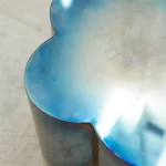 Shaped like five petals, the stainless steel table has a blue hue that runs down the base in a gradient created by the heat treatment of the steel. These details reflect the structure and bright celestial color of the periwinkle flower.