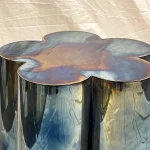Shaped like five petals, the stainless steel table features a gradient blue hue running down the base, achieved through heat treatment. This process was central to our material experimentation, as we explored various firing techniques to understand how heat transforms steel.