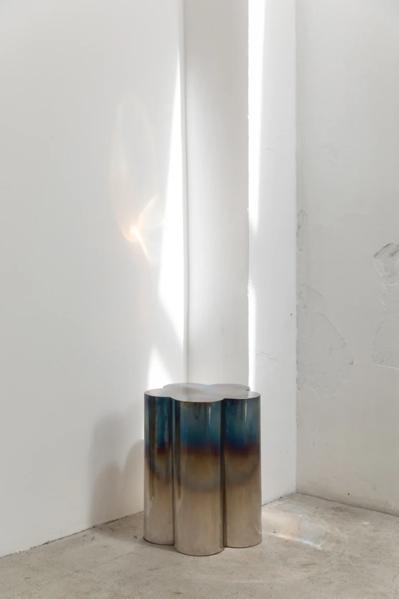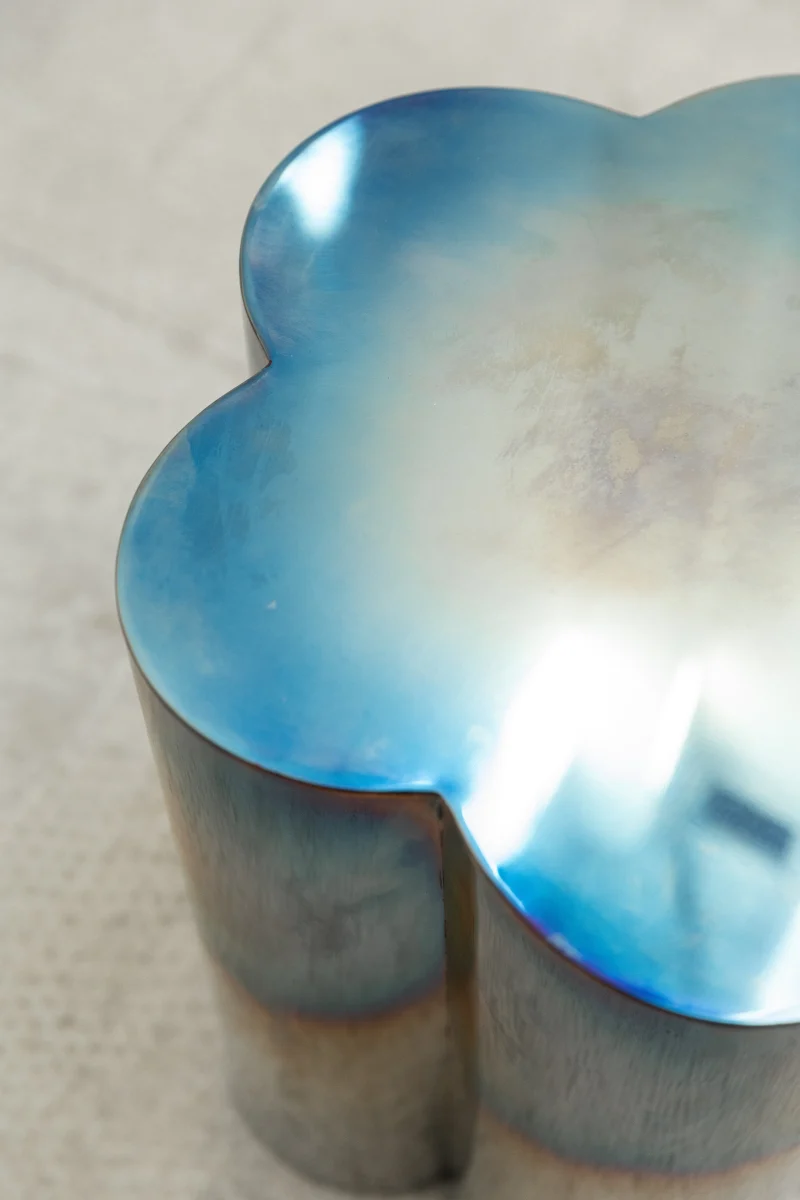 Shaped like five petals, the stainless steel table has a blue hue that runs down the base in a gradient created by the heat treatment of the steel. These details reflect the structure and bright celestial color of the periwinkle flower.
