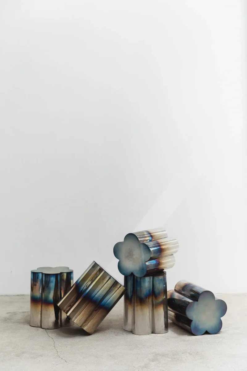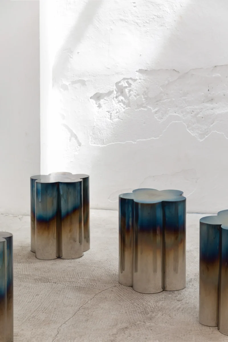 Often inspired by nature, this time FURN OBJECTS went to explore our roots, deriving inspiration from the cultural heritage of Ukraine. This table, shaped like the “barvinok” flower, tells a story of a well-balanced character, combining strength and determination with serenity and peace. We translated it by turning metal into the gentle shape of five petals and using fire to reach the soft gradient effect.