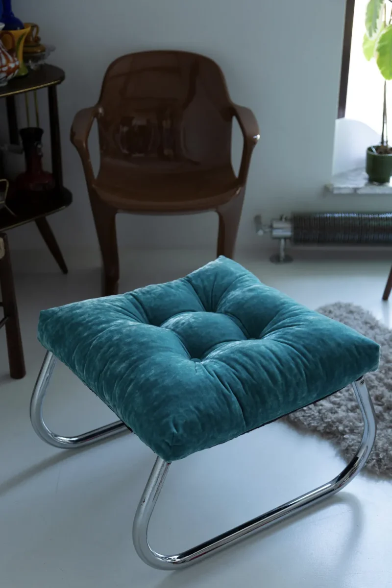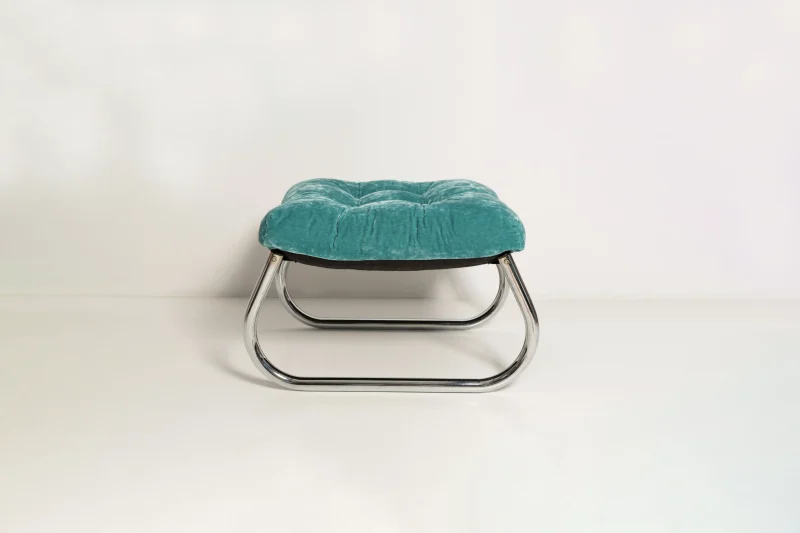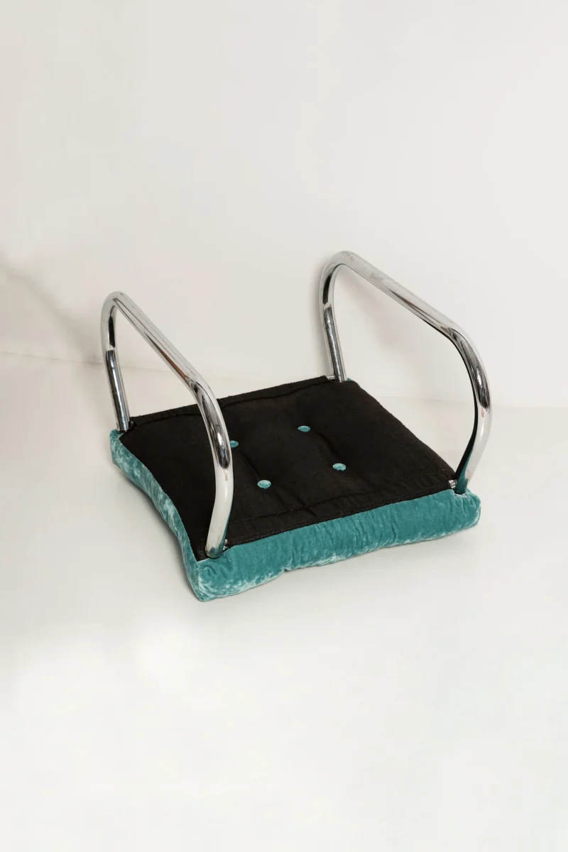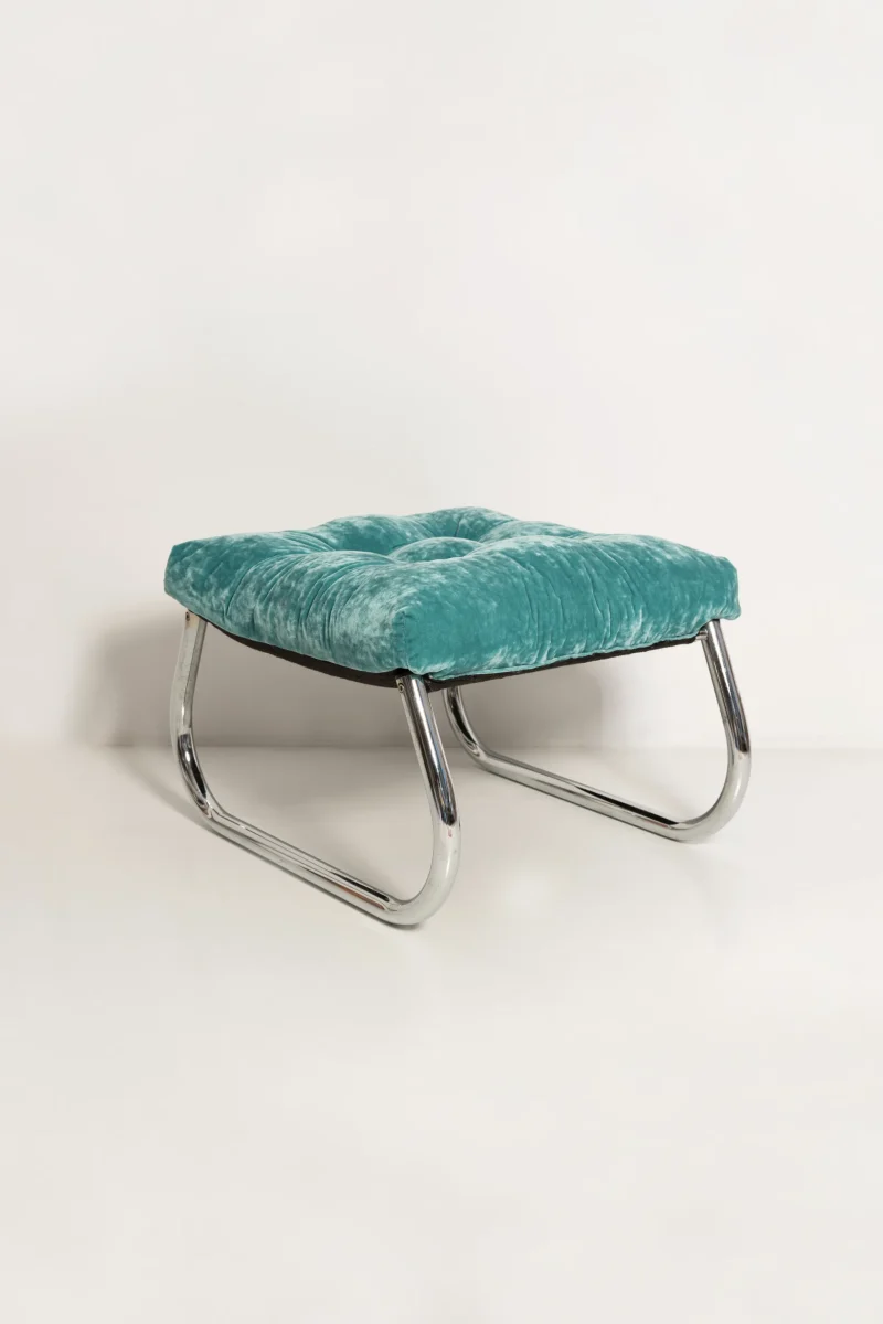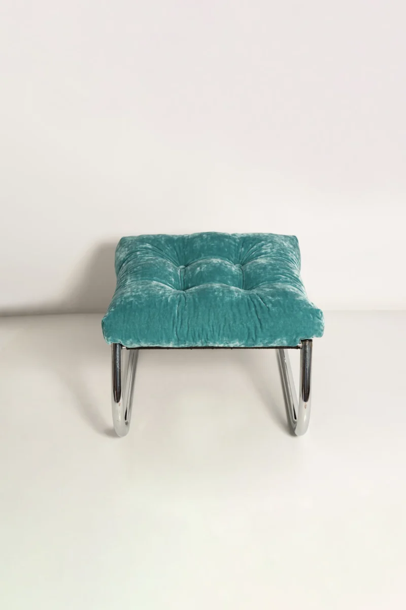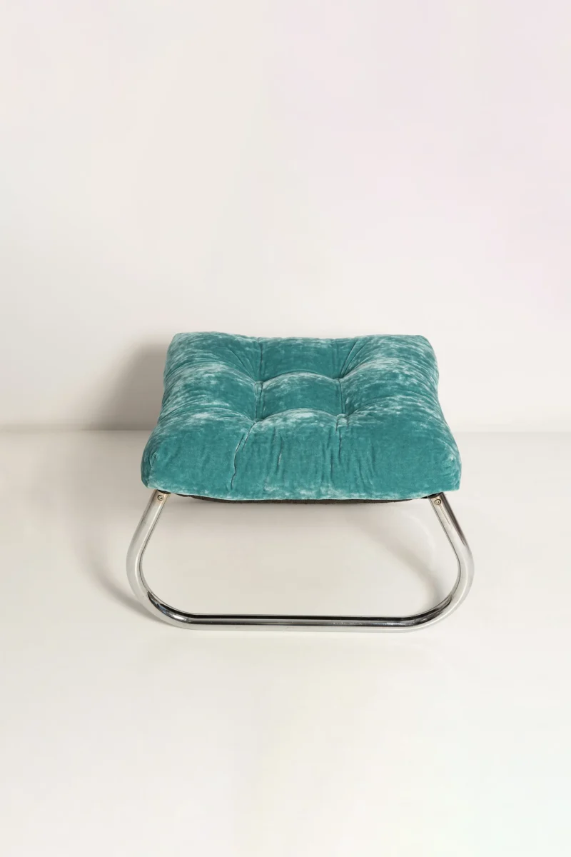 This Modernist Bauhaus–inspired Art Deco footstool features a sleek chrome frame and clean, geometric lines characteristic of early 20th-century design movements. Fully restored, the piece has been meticulously cleaned to reveal the brilliance of its original chrome finish and upholstered with new, high-quality fabric that complements its minimalist elegance. Perfect as a statement piece in a living room, bedroom, or office, this footstool blends functional comfort with timeless modernist style, making it a collectible addition for enthusiasts of Bauhaus and Art Deco furniture.