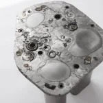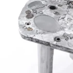 The shape/dimensions of the table as well as the precious inserts can be customized. The final texture depends on random reactions produced during the casting and can’t be fully anticipated