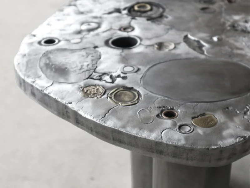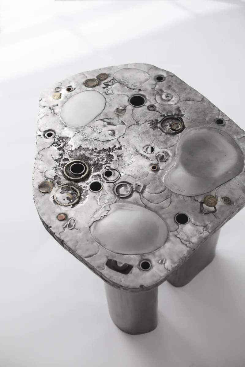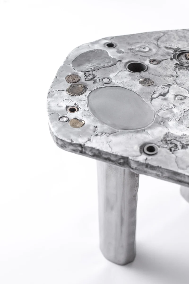 Studio Kloumi’s table takes inspiration from Bauxite, the main ore of aluminum. The designer chose cast aluminum for its strength and clean, metallic look.