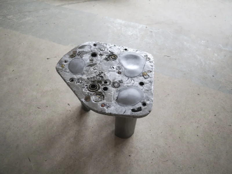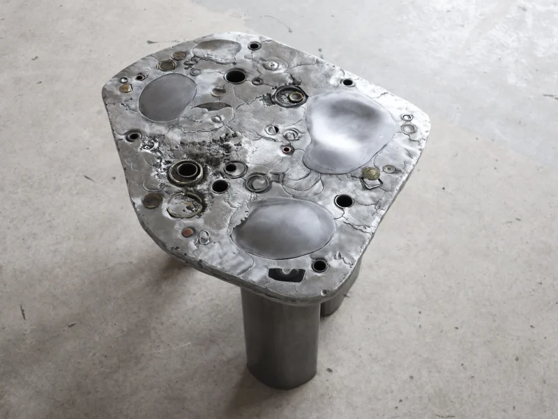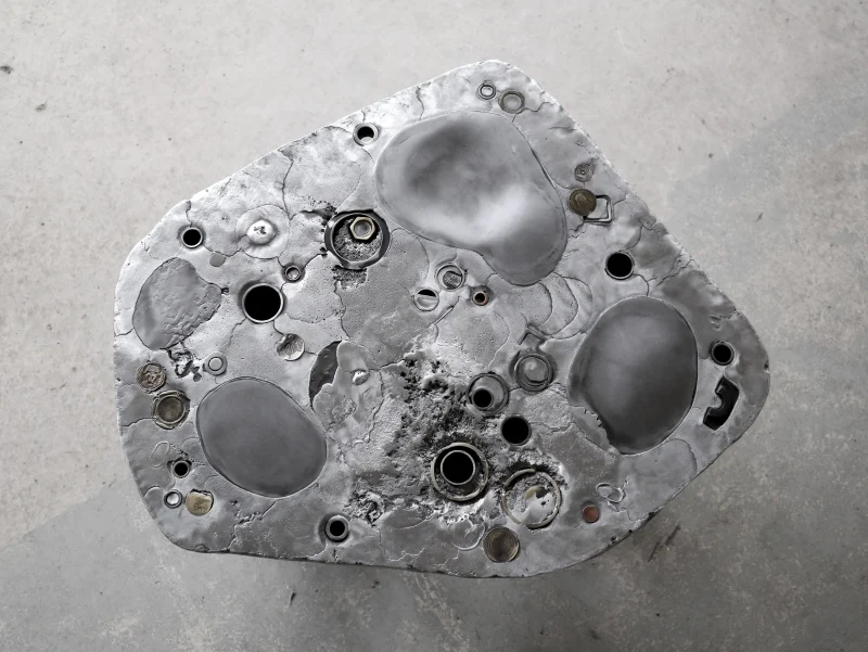 After that, they poured in the molten aluminum. The metal scraps reacted in unique ways, creating unexpected textures and patterns. As a result, the surface feels raw, rich, and full of detail.