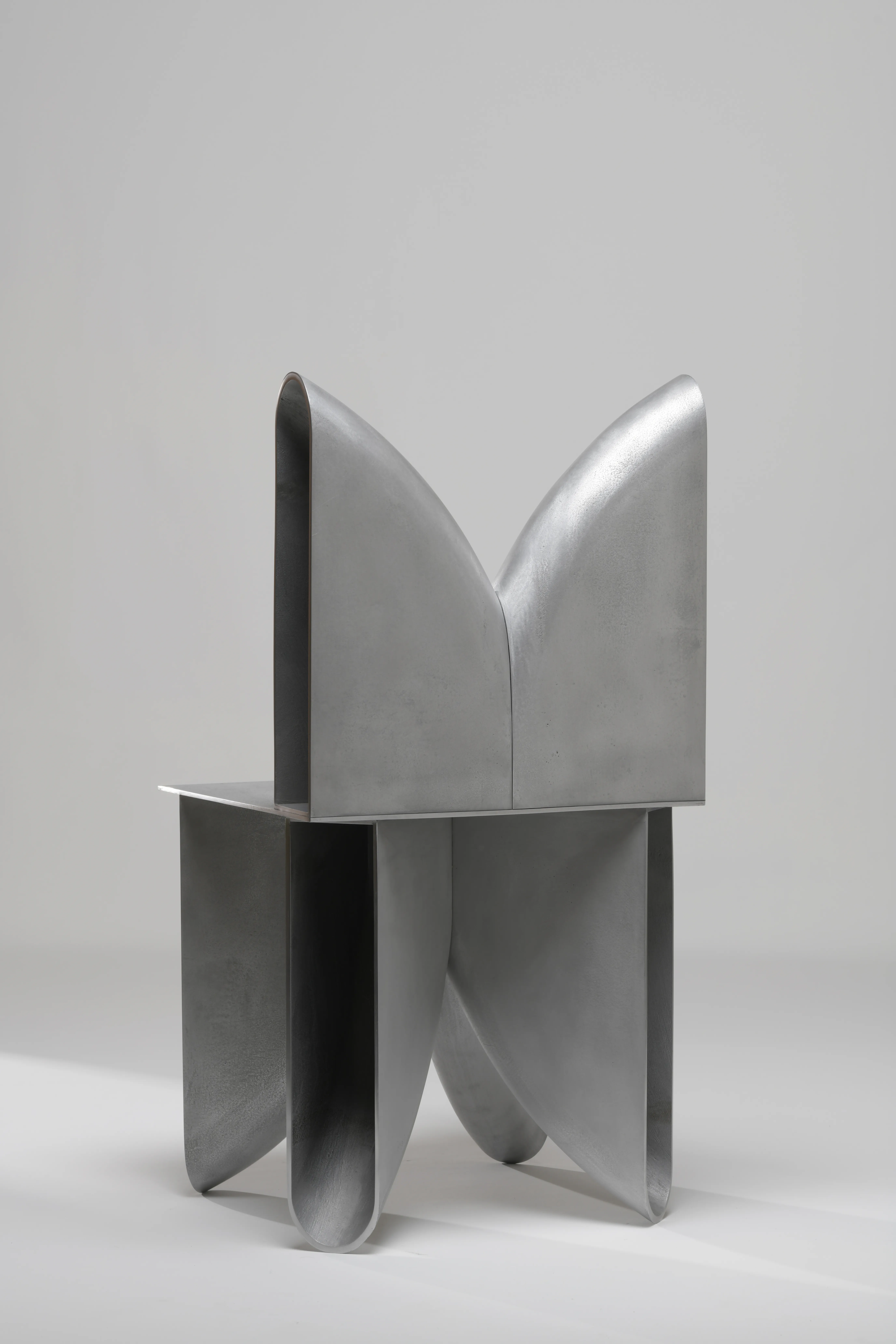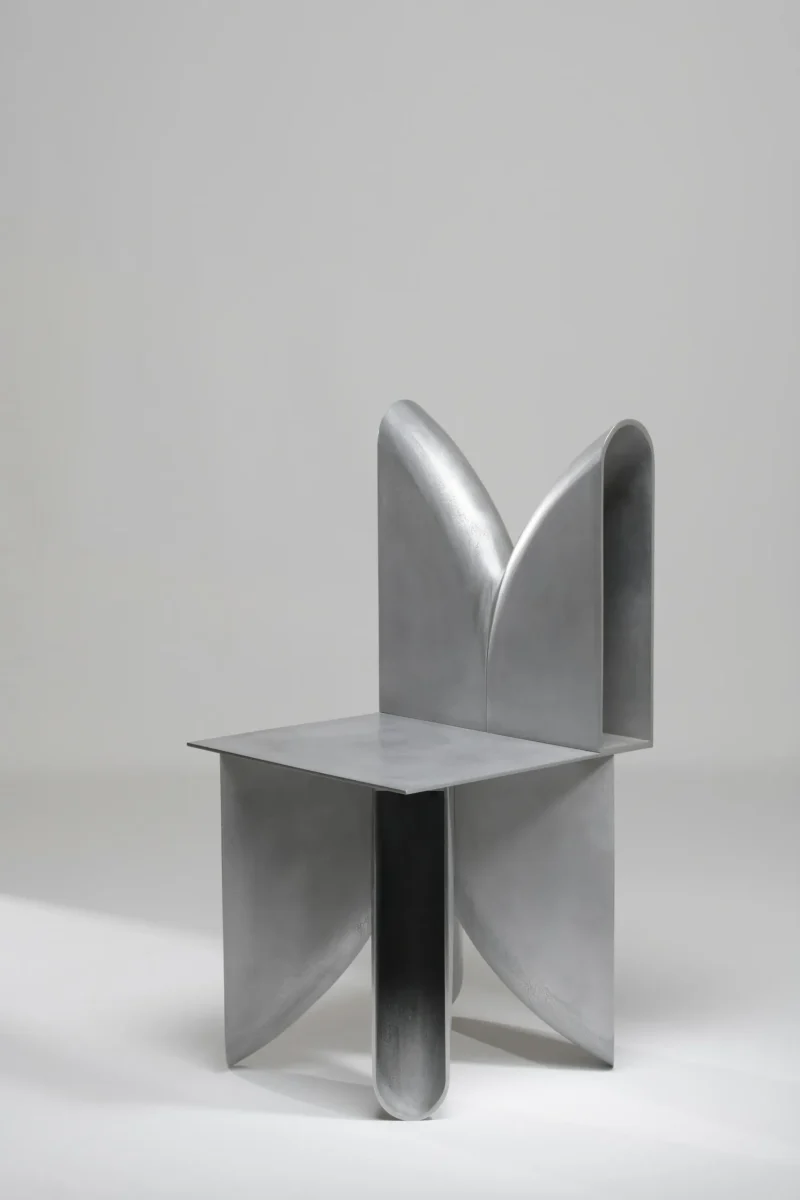 The idea comes from the convergence of tectonic experiments in material and form, whereby many parts of the same can make a whole. The basic structural form – a simple wheel forged from aluminium – is divided, repeated, and assembled in a poetic manner to make a chair that is aesthetically striking and surprisingly comfortable; the nape supports the back. The sand cast technique also employs a process of repetition. A single mould hand carved from wood is used to make another mould from sand-resin into which molten aluminium is poured. The same sandcasted piece is poured six times for each of the chair’s limbs.