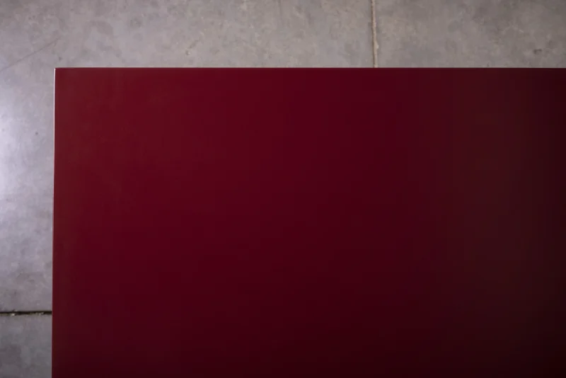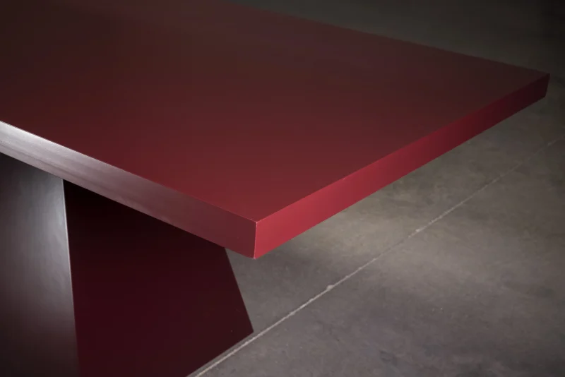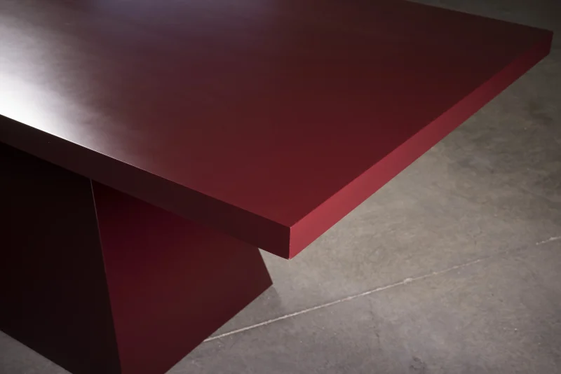 Deep dark red lacquer dining table with pyramid pedestal by NO AGE STUDIO.