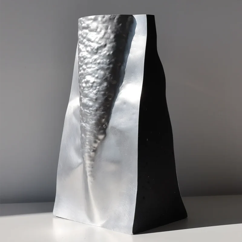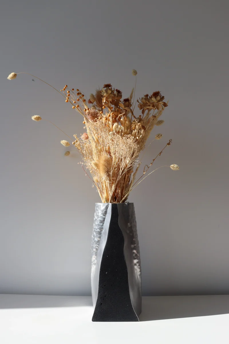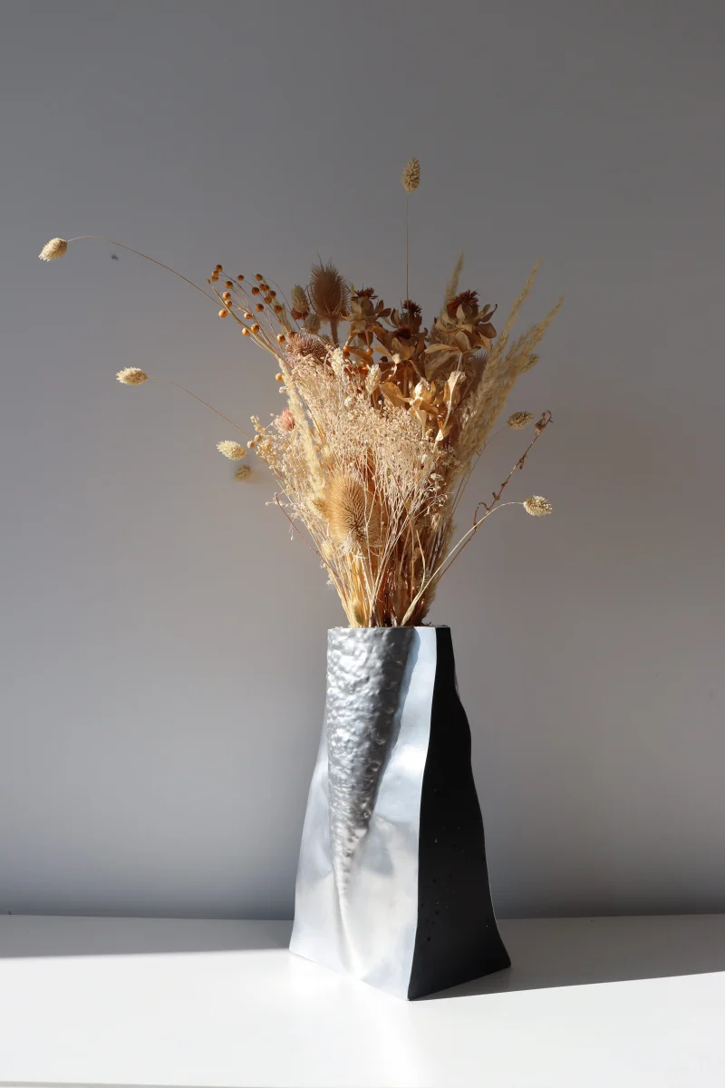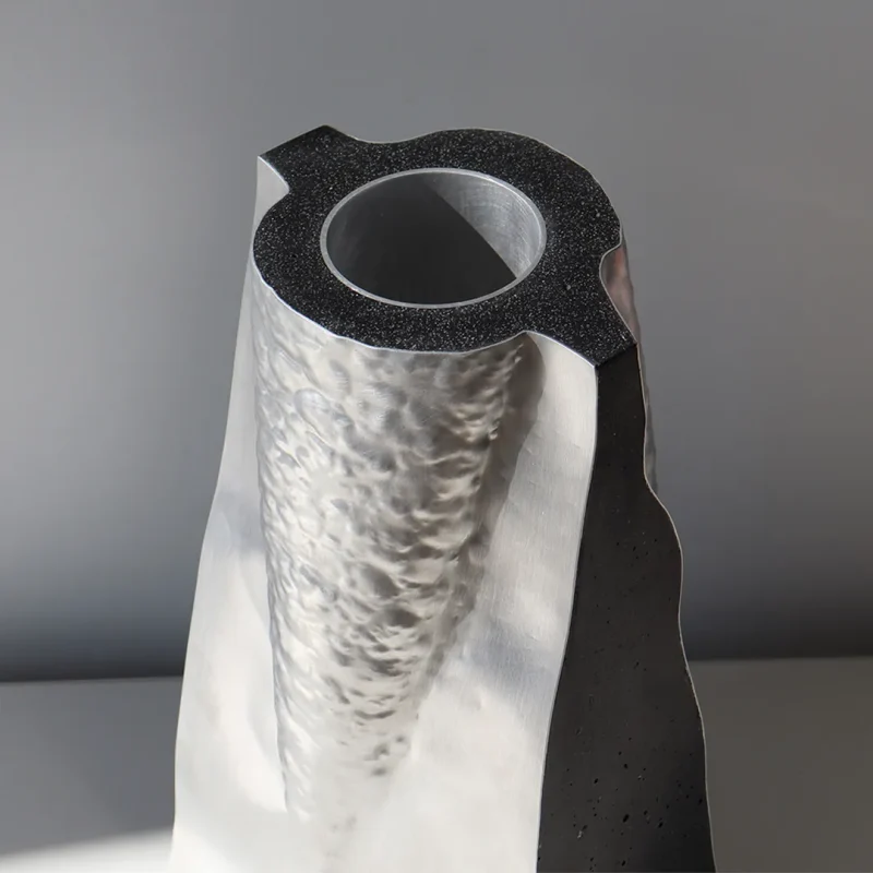 Originally from Italy, Emilia draws inspiration from her Sicilian heritage and the raw, volcanic landscapes that define the island. Her most recent series, ETNA, channels this connection to land and energy. The collection combines hand-hammered aluminium with pigmented jesmonite, using metal sheets as both form and mould. The result is a monolithic, textural piece celebrating material tension, weight, and surface irregularity.