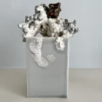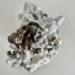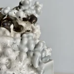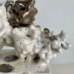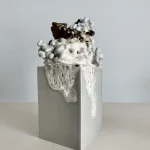 BEHOLD:BECOME is a limited edition of unique pieces. On small pedestals organic shapes are frozen in poses. The organic shapes are made from plant material collected in nature and preserved in porcelain. The fragile natural imprints break into smaller pieces in the first fire and are reused in loosely stacked structures on top of the base. In the second fire the glazes develop and takes shape and the base and top are unified in a tableau – a snapshot of a movement.