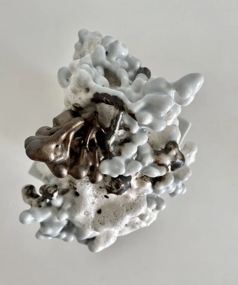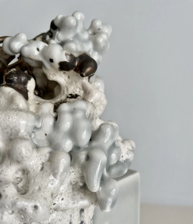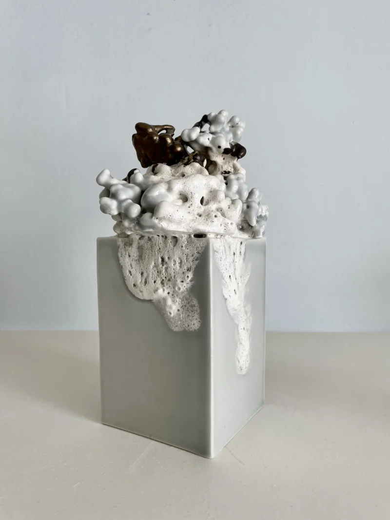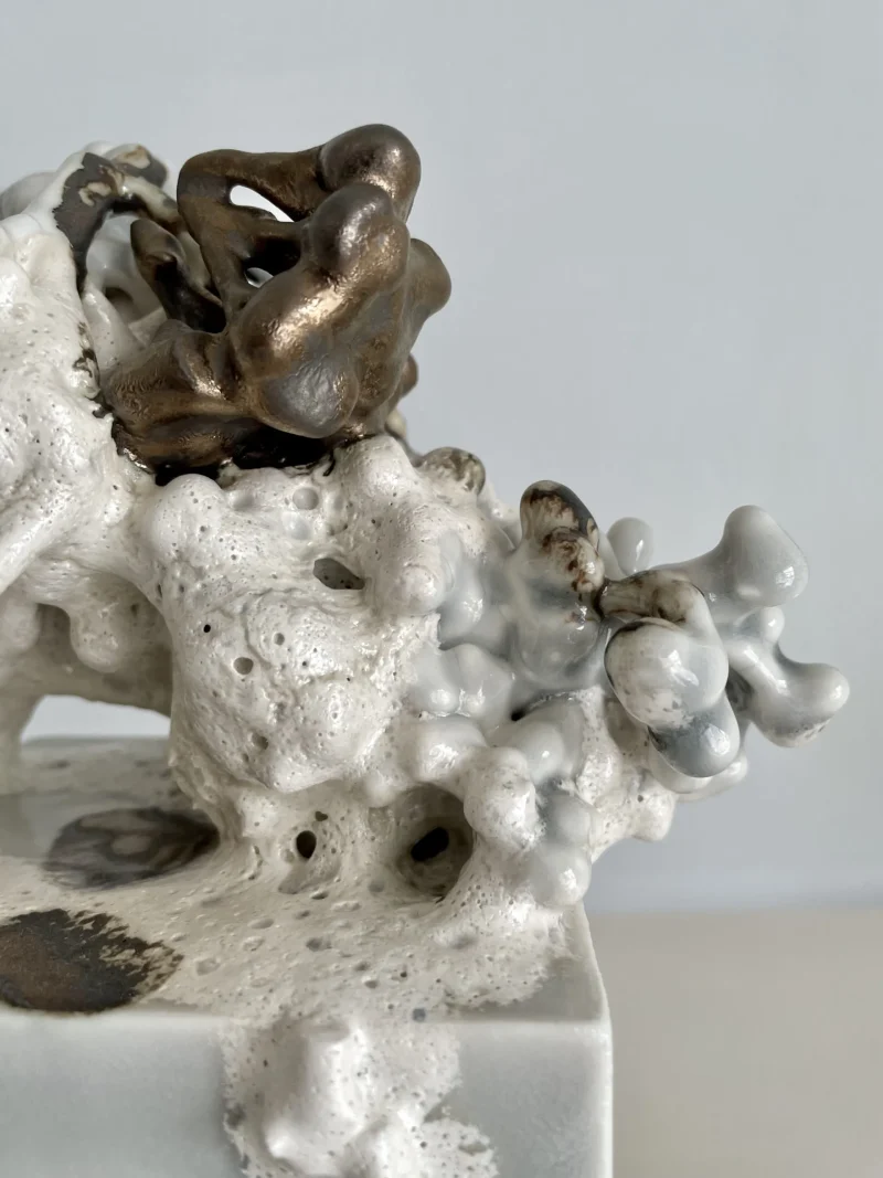 BEHOLD:BECOME is a limited edition of unique pieces. On small pedestals organic shapes are frozen in poses. The organic shapes are made from plant material collected in nature and preserved in porcelain. The fragile natural imprints break into smaller pieces in the first fire and are reused in loosely stacked structures on top of the base. In the second fire the glazes develop and takes shape and the base and top are unified in a tableau – a snapshot of a movement.
