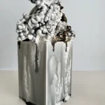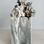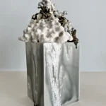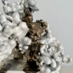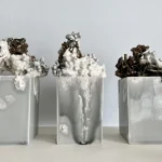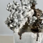 BEHOLD:BECOME is a limited edition of unique pieces. On small pedestals organic shapes are frozen in poses. The organic shapes are made from plant material collected in nature and preserved in porcelain. The fragile natural imprints break into smaller pieces in the first fire and are reused in loosely stacked structures on top of the base. In the second fire the glazes develop and takes shape and the base and top are unified in a tableau – a snapshot of a movement.