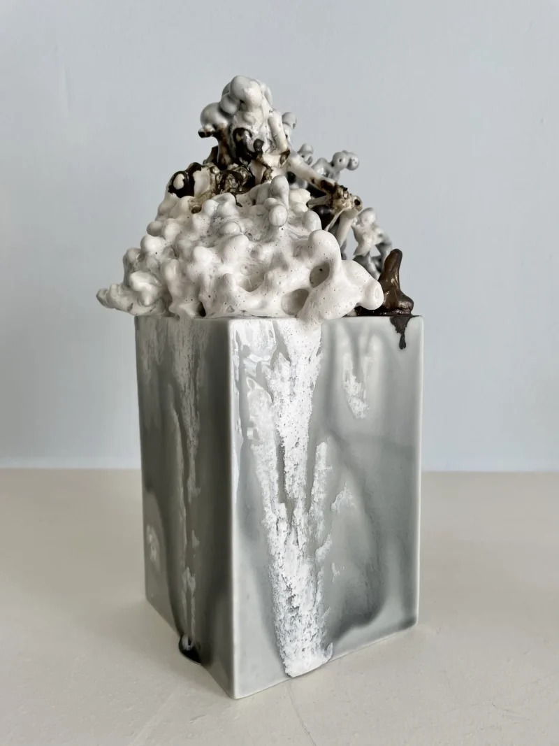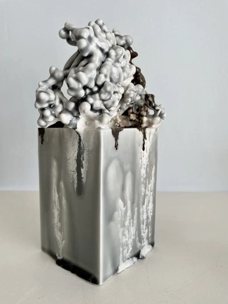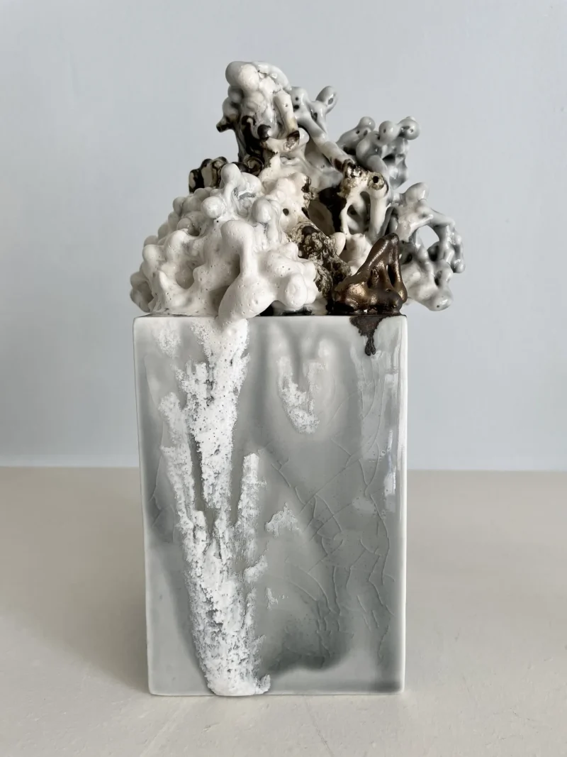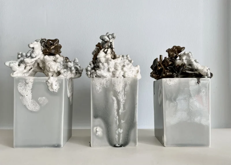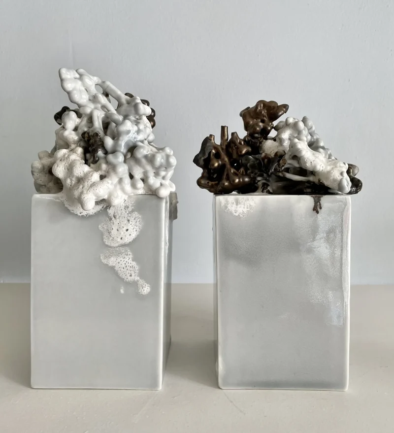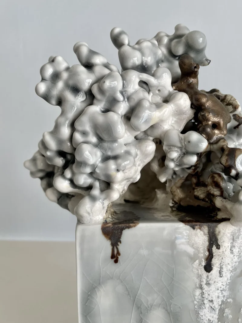 BEHOLD:BECOME is a limited edition of unique pieces. On small pedestals organic shapes are frozen in poses. The organic shapes are made from plant material collected in nature and preserved in porcelain. The fragile natural imprints break into smaller pieces in the first fire and are reused in loosely stacked structures on top of the base. In the second fire the glazes develop and takes shape and the base and top are unified in a tableau – a snapshot of a movement.