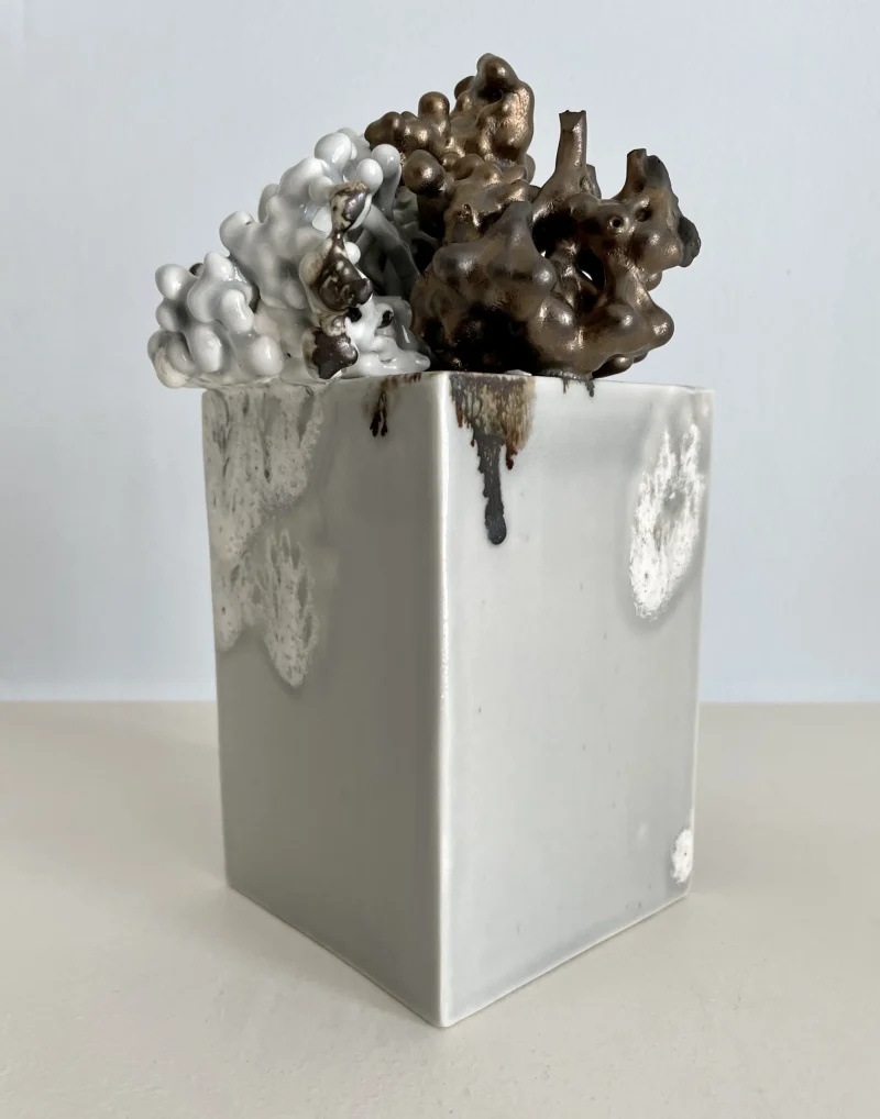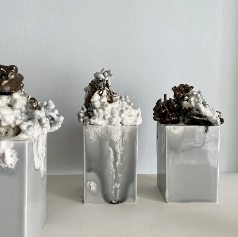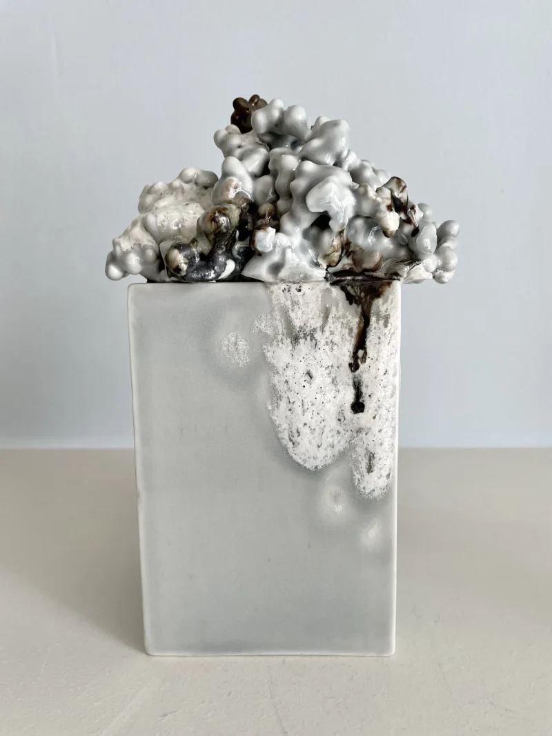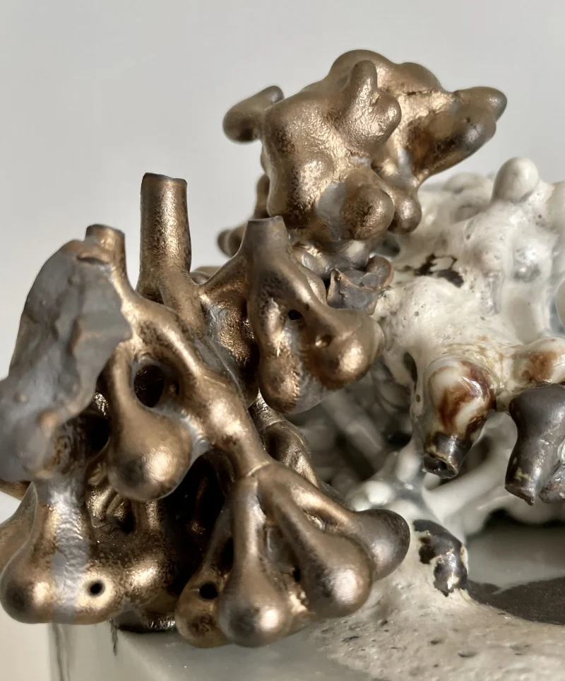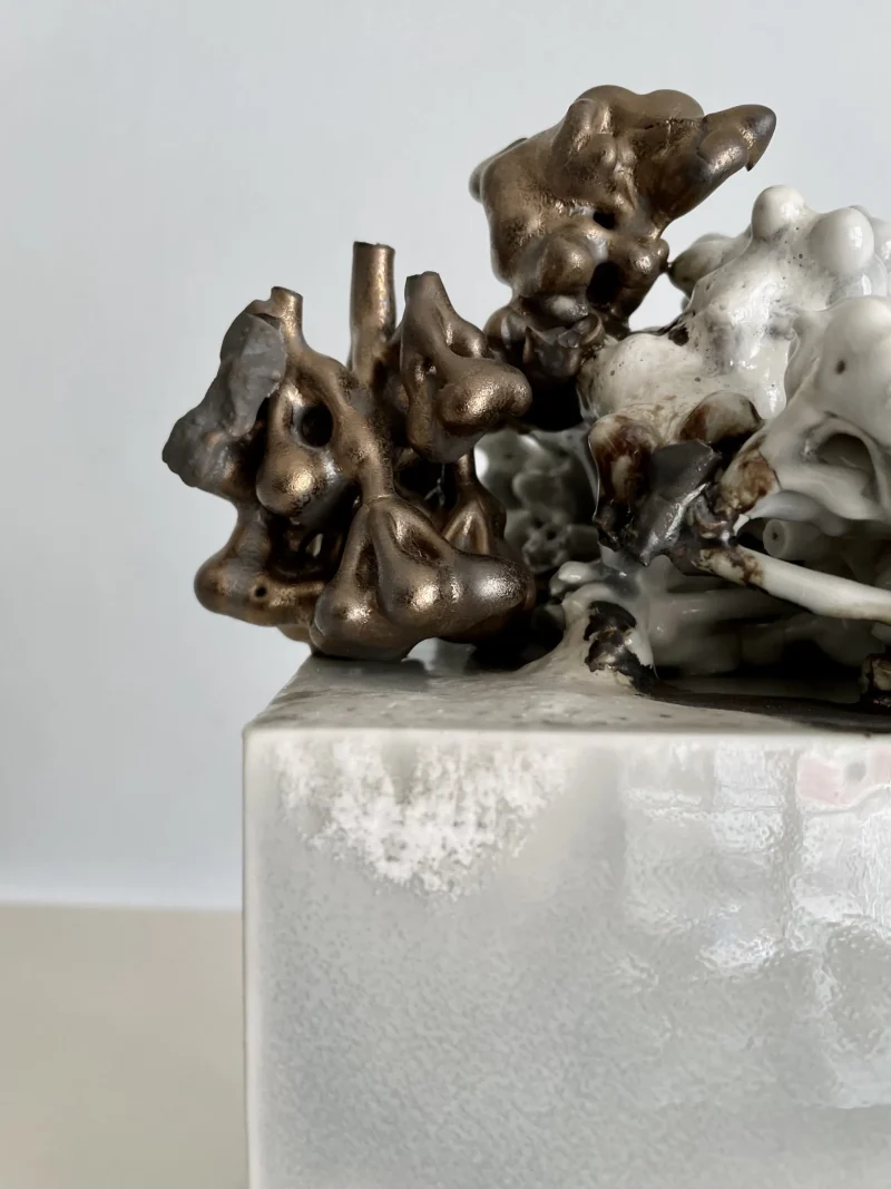BEHOLD:BECOME is a limited edition of unique pieces. On small pedestals organic shapes are frozen in poses. The organic shapes are made from plant material collected in nature and preserved in porcelain. The fragile natural imprints break into smaller pieces in the first fire and are reused in loosely stacked structures on top of the base. In the second fire the glazes develop and takes shape and the base and top are unified in a tableau – a snapshot of a movement.