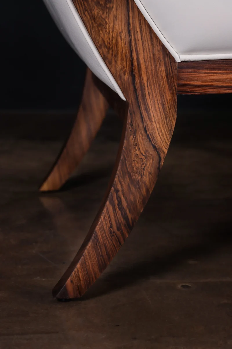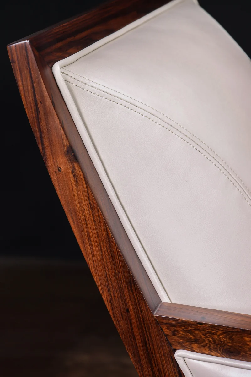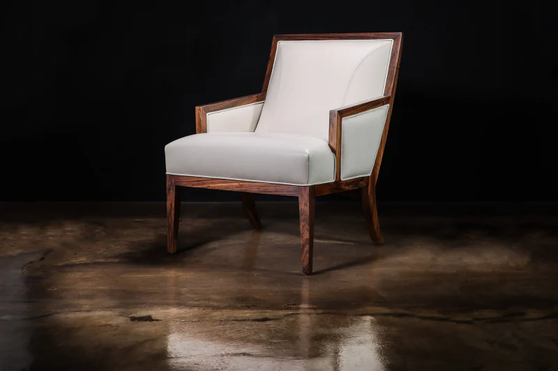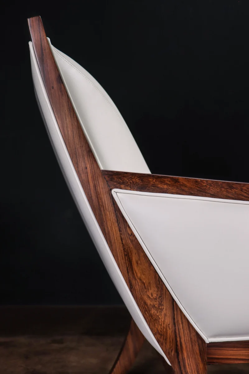 The Belgrano Lounge Chair by Costantini Design is inspired by mid-20th century modernist design. It features a decorative stich detail that runs from the top corner of the chair to the seat. Shown in Argentine Rosewood finish and white leather and available as shown or in the finish and upholstery Material of your choice.