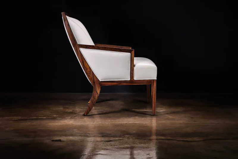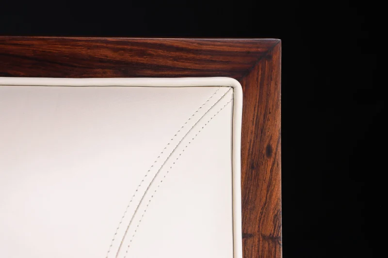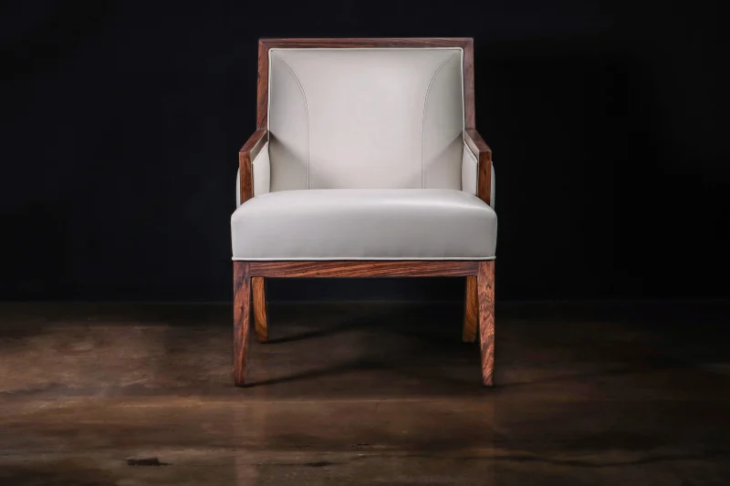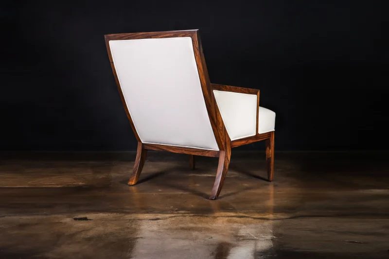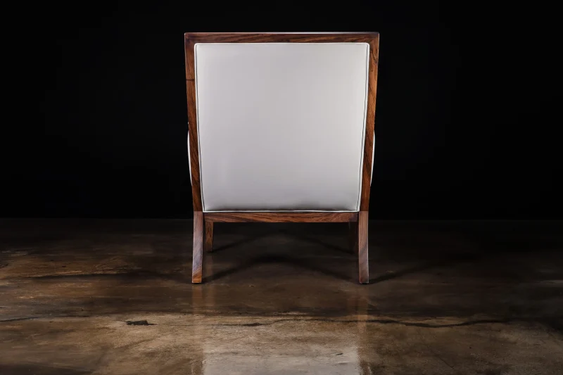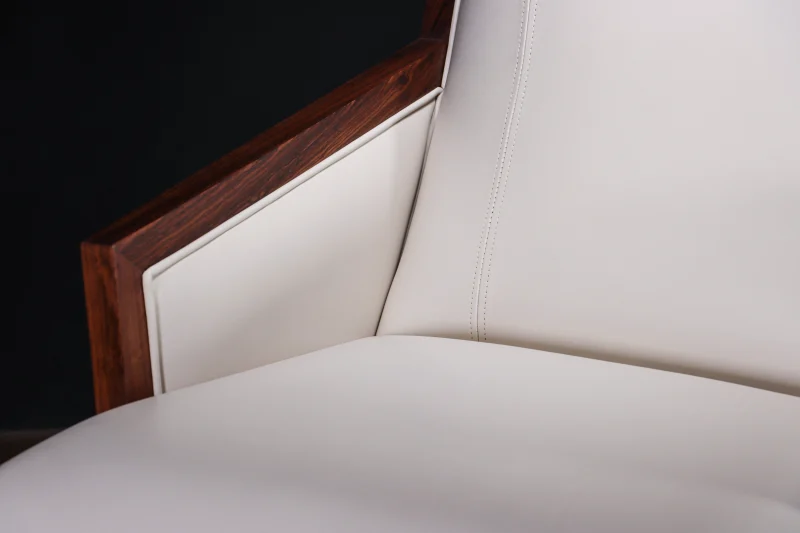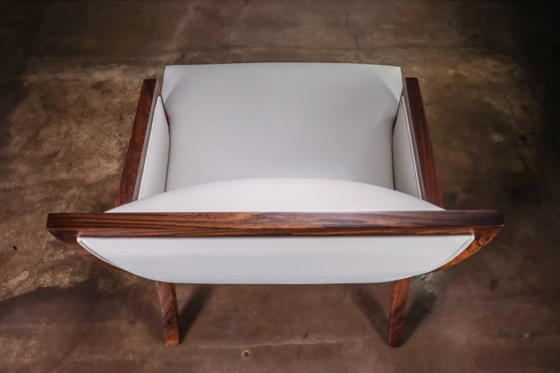 The Belgrano Lounge Chair by Costantini Design is inspired by mid-20th century modernist design. It features a decorative stich detail that runs from the top corner of the chair to the seat. Shown in Argentine Rosewood finish and white leather and available as shown or in the finish and upholstery Material of your choice.