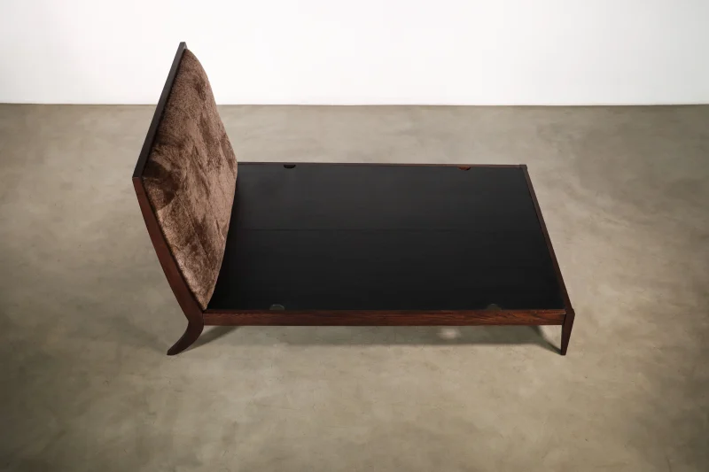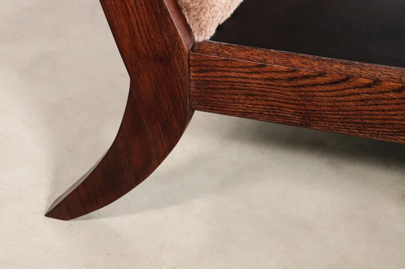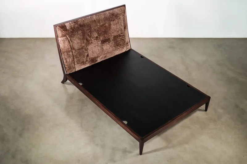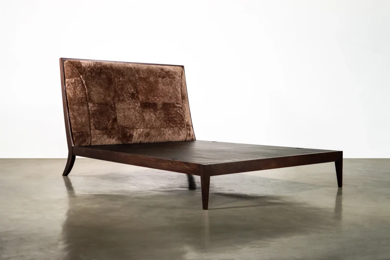 Belgrano Sheepskin and Exotic Wood Contemporary Designer Bed from Costantini. The Belgrano bed from Costantini is handmade using solid wood (shown in smoked oak) and an upholstered headboard, shown in sheepskin, but available in any fabric, leather or COM/COL. It features an ergonomic headboard that eliminates the need to create “pillow structures” to help one sit up for dining, working or anything else that’s best done in bed.