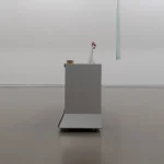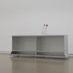 Storage and bench by Andy Kim, originally designed for someone named Harry. This unit features shelving designed to accommodate a variety of items—books, shoes, pots, towels, a TV, and more. With adjustable leveling feet, it gently float in space.
