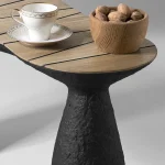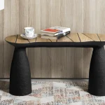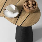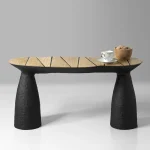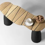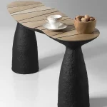 The tabletop is made of natural oak, and the base of the table, resembling concrete in appearance, is made by pouring solid mass. The set task was technologically challenging – it was necessary to fuse wet mass and moisture-sensitive wood. The entire structure of the table is manufactured at the same time, so that the two materials join together smoothly and precisely to avoid any gaps. After the product dries, it is scrubbed, and the tabletop is oiled.