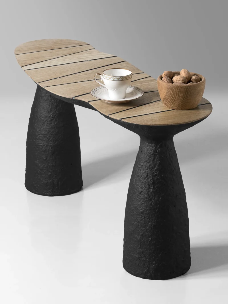 The black concrete-like material is the result of various experiments. It is a mixture of several components: an eco-friendly of cement, recycled paper, glue, and paint. Dried it becomes as strong as wood, it resembles concrete but is slightly elastic, so it does not split or crumble.The result is a natural texture and strength that ensures durability.