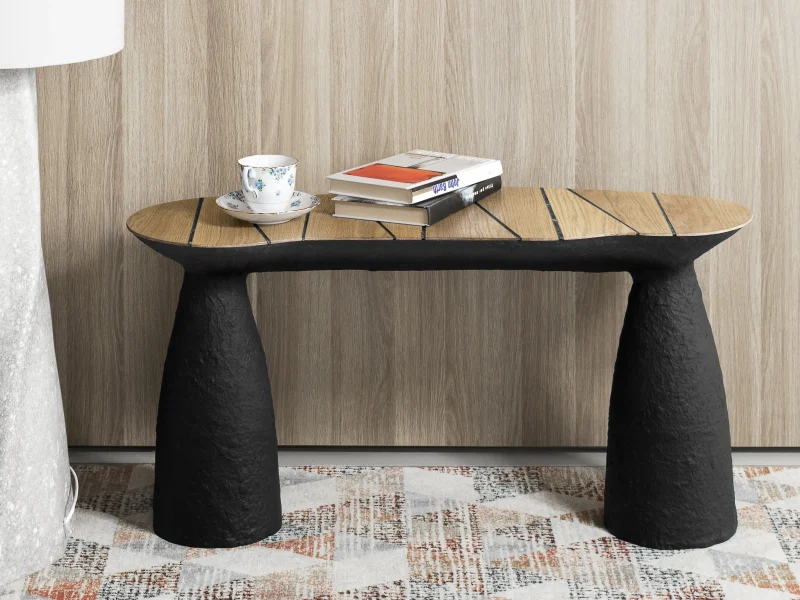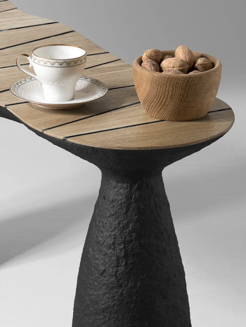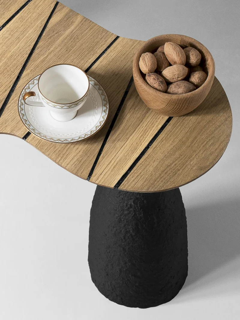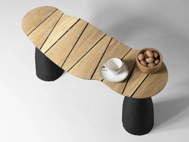 The tabletop is made of natural oak, and the base of the table, resembling concrete in appearance, is made by pouring solid mass. The set task was technologically challenging – it was necessary to fuse wet mass and moisture-sensitive wood. The entire structure of the table is manufactured at the same time, so that the two materials join together smoothly and precisely to avoid any gaps. After the product dries, it is scrubbed, and the tabletop is oiled.