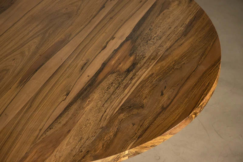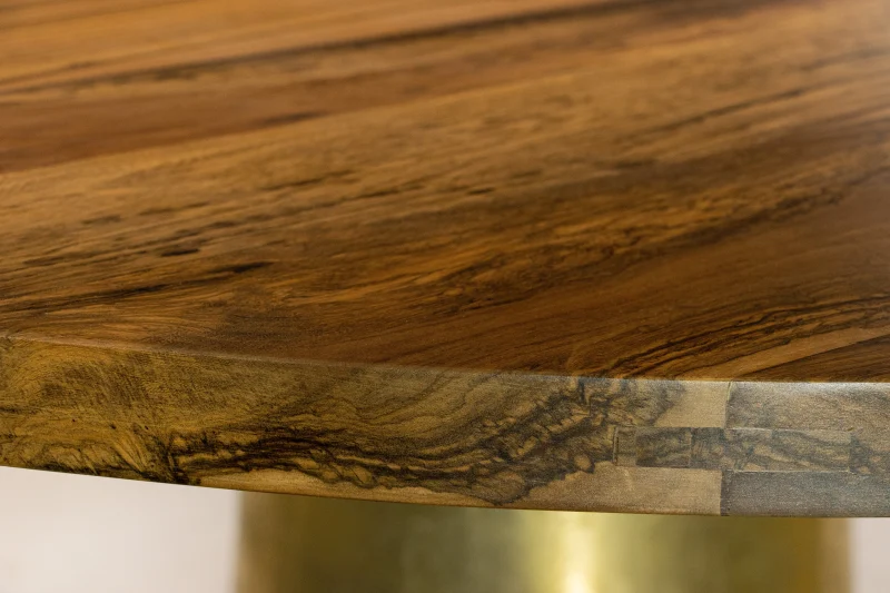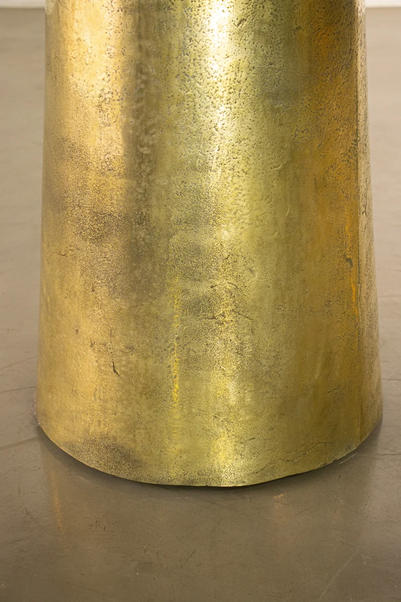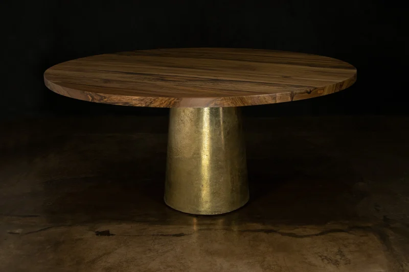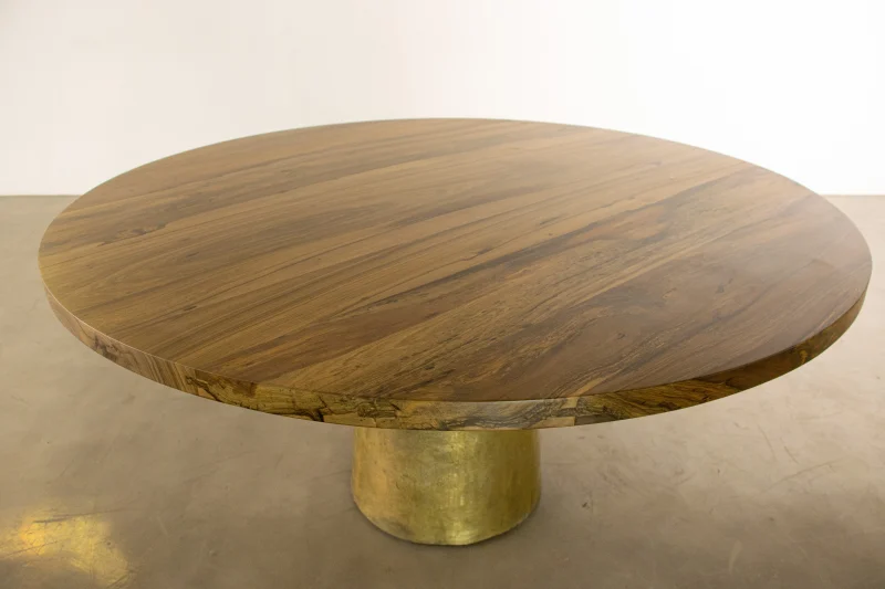 The Benino Round Pedestal Table by Costantini Design features a cast bronze base that is only partially polished in order to highlight the imperfections that evidence the burnt earth that once surrounded it during the casting process. Its top, by contrast, is finished smooth and in your choice of material and color. Shown in Argentine Rosewood with straight edge. Available also in stone or lacquered top, and in any size or finish.