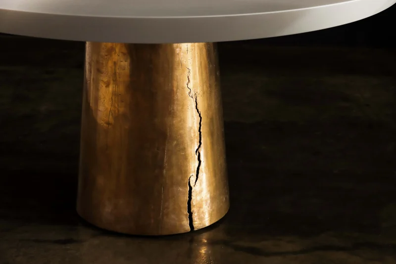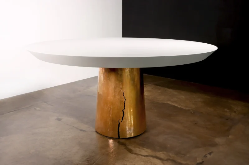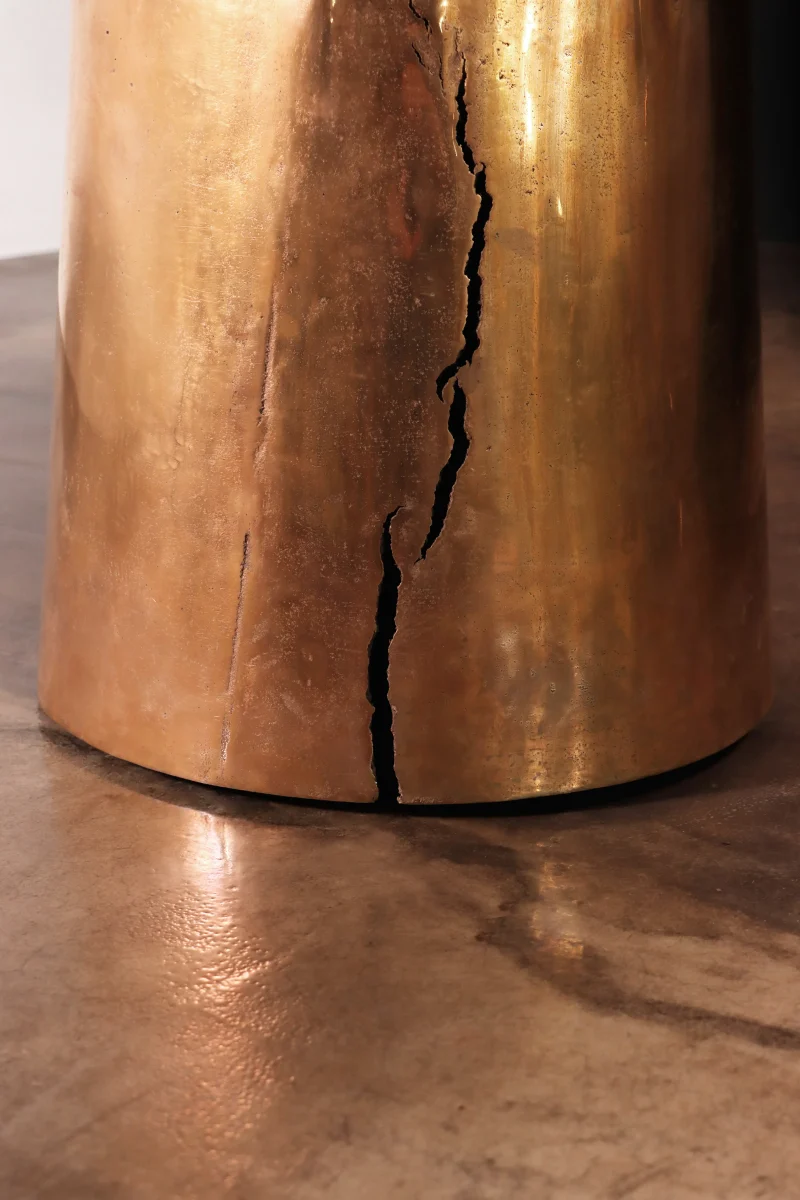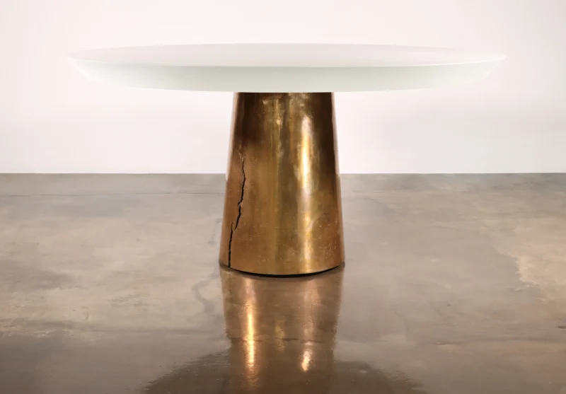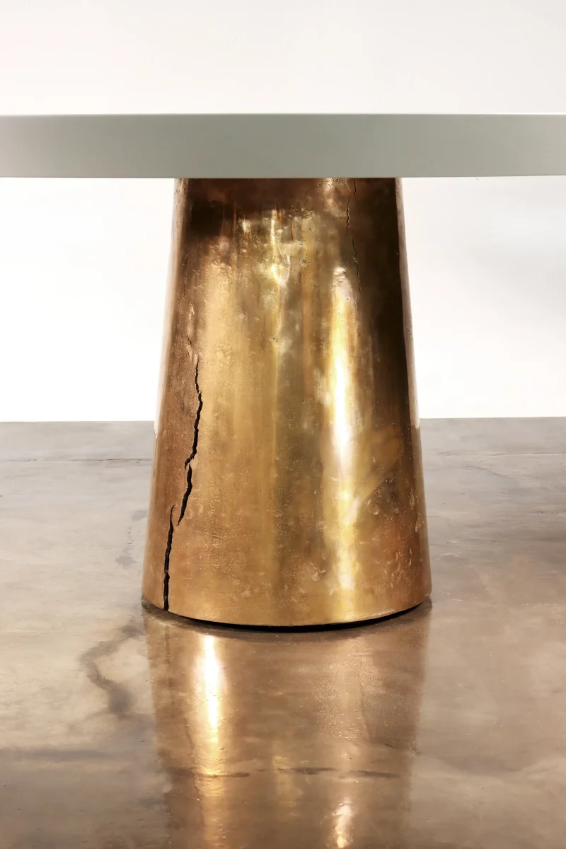 The Beninx Round Pedestal Table by Costantini Design features a cast bronze base that is only partially polished in order to highlight the imperfections that evidence the burnt earth that once surrounded it during the casting process. Its top, by contrast, is finished smooth and in your choice of material and color. This is one of two pieces that feature a naturally occurring “crack” from the casting process.