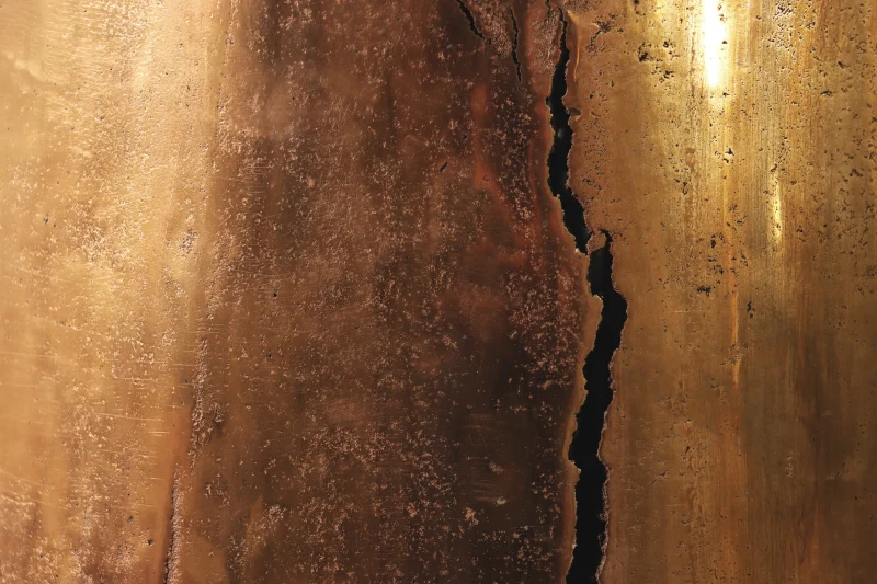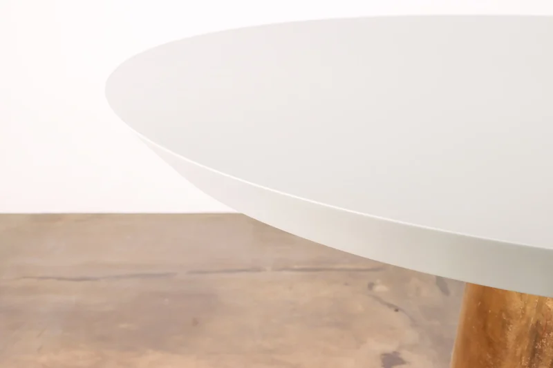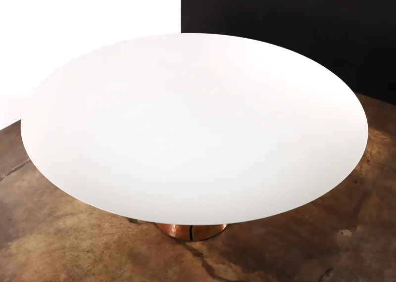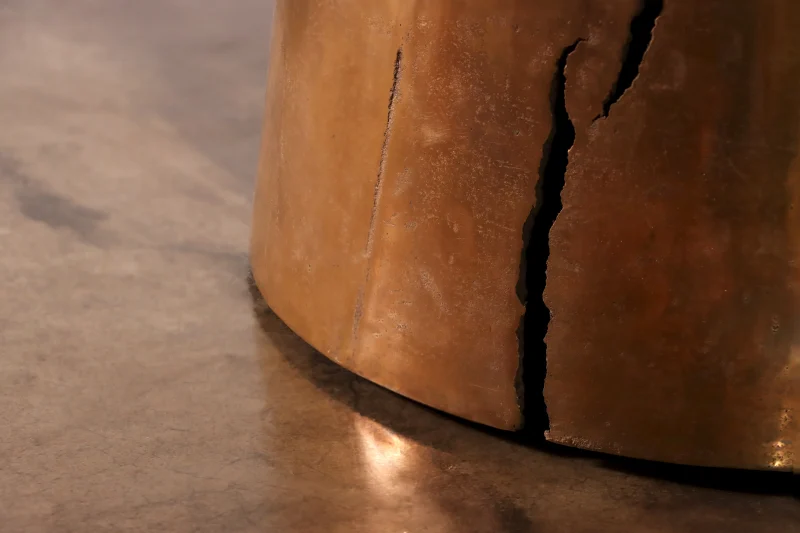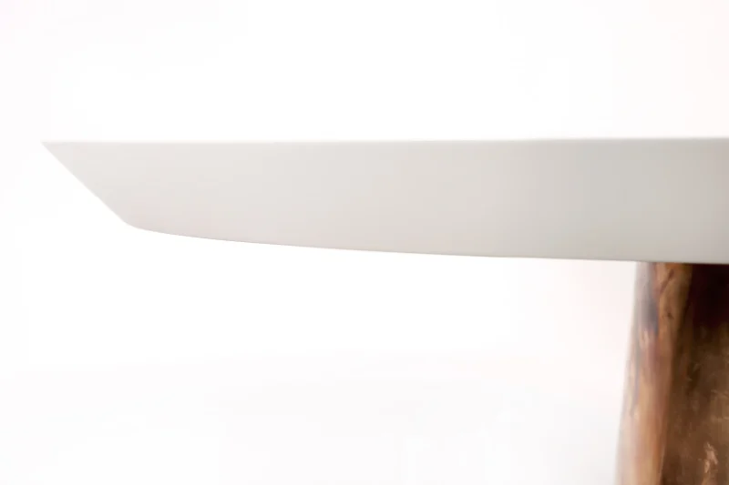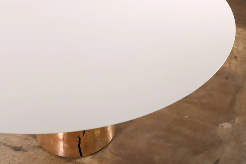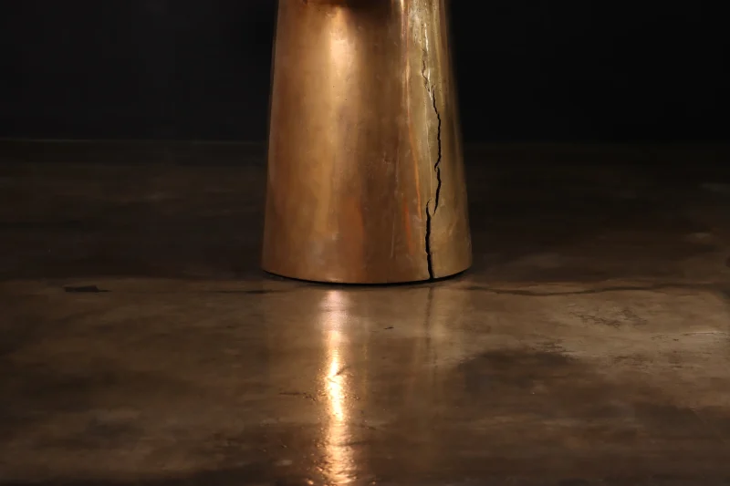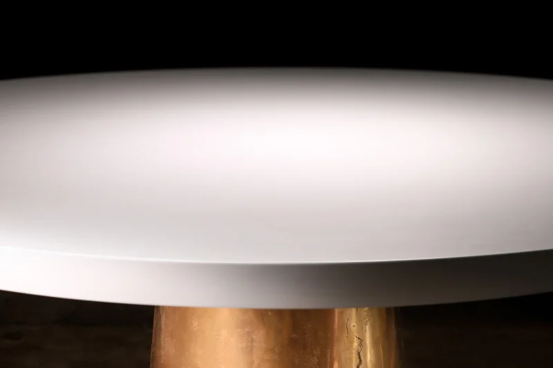 The Beninx Round Pedestal Table by Costantini Design features a cast bronze base that is only partially polished in order to highlight the imperfections that evidence the burnt earth that once surrounded it during the casting process. Its top, by contrast, is finished smooth and in your choice of material and color. This is one of two pieces that feature a naturally occurring “crack” from the casting process.