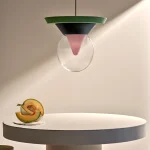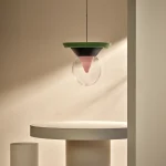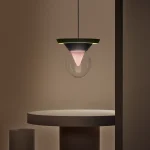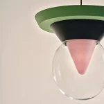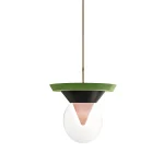The pendant lamp Bia consists of transparent glass, in which the light reflects, shining through a pink-pigmented, funnel-shaped glass from the interior of the lamp, as well as dark green painted ceramic with a matte finish, and light green lacquered wood, also with a matte finish. A suspension tube made of iron, coloured gold-silver, holds the lamp stable and secure, with the length of the suspension being variable. The pendant lamp Bia was handcrafted, making each piece a unique item. Due to this individual manufacturing, the lamps may vary in material and surface from the model shown in the photos.