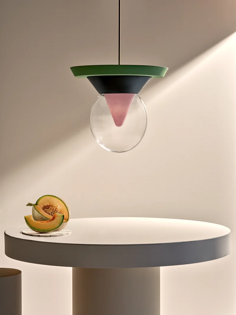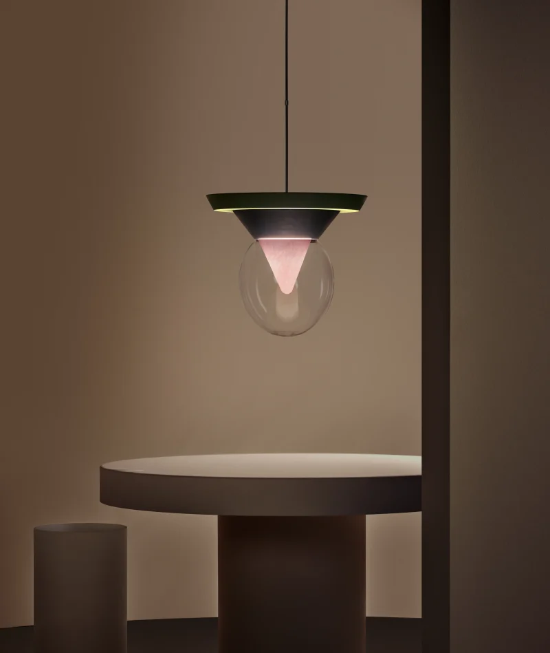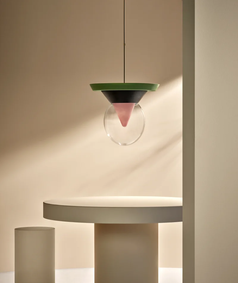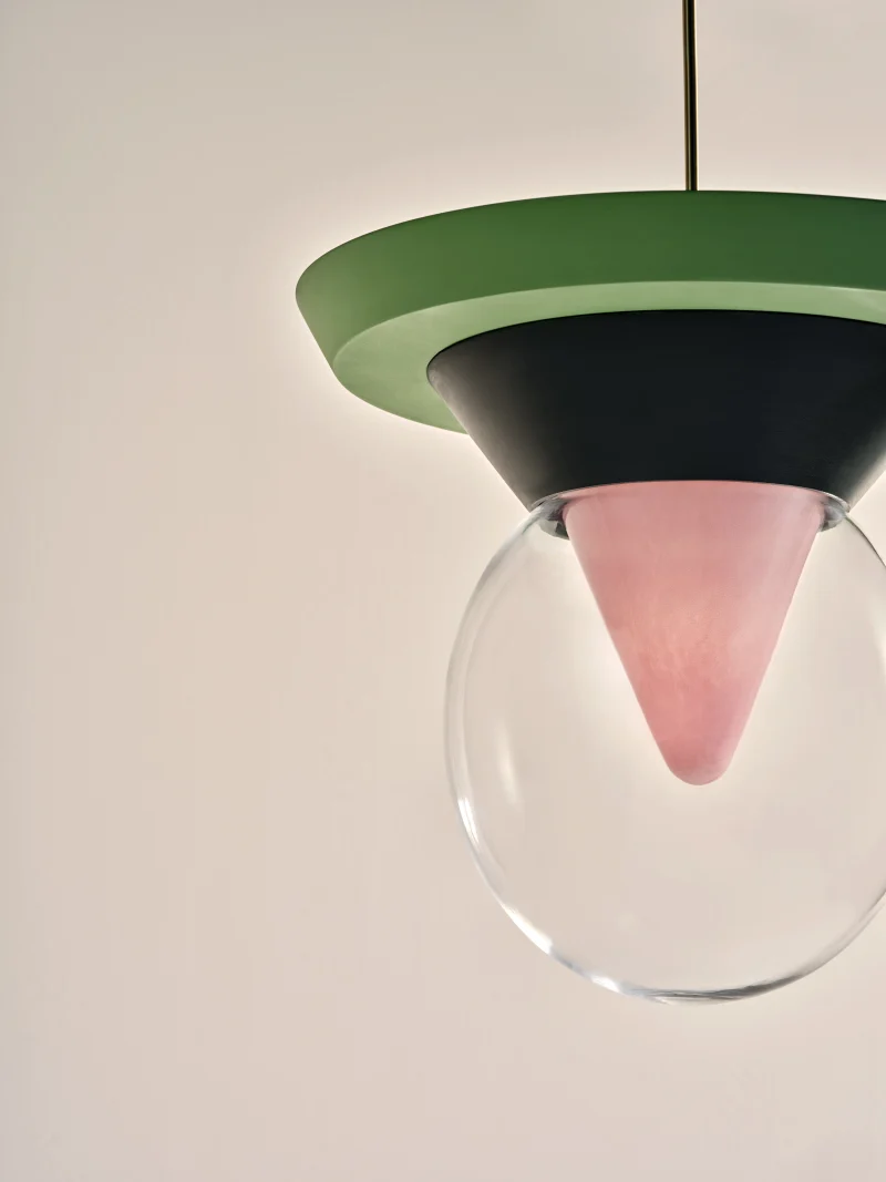The pendant lamp Bia consists of transparent glass, in which the light reflects, shining through a pink-pigmented, funnel-shaped glass from the interior of the lamp, as well as dark green painted ceramic with a matte finish, and light green lacquered wood, also with a matte finish. A suspension tube made of iron, coloured gold-silver, holds the lamp stable and secure, with the length of the suspension being variable. The pendant lamp Bia was handcrafted, making each piece a unique item. Due to this individual manufacturing, the lamps may vary in material and surface from the model shown in the photos.