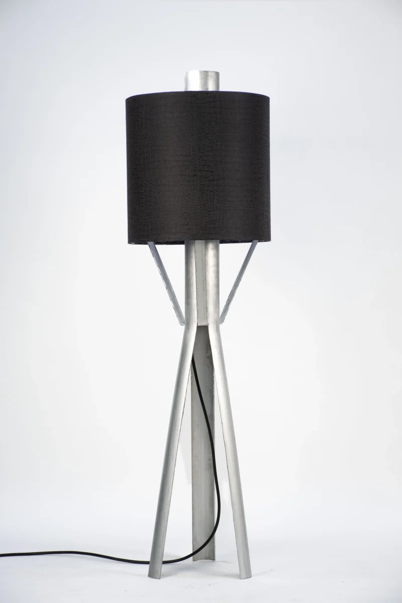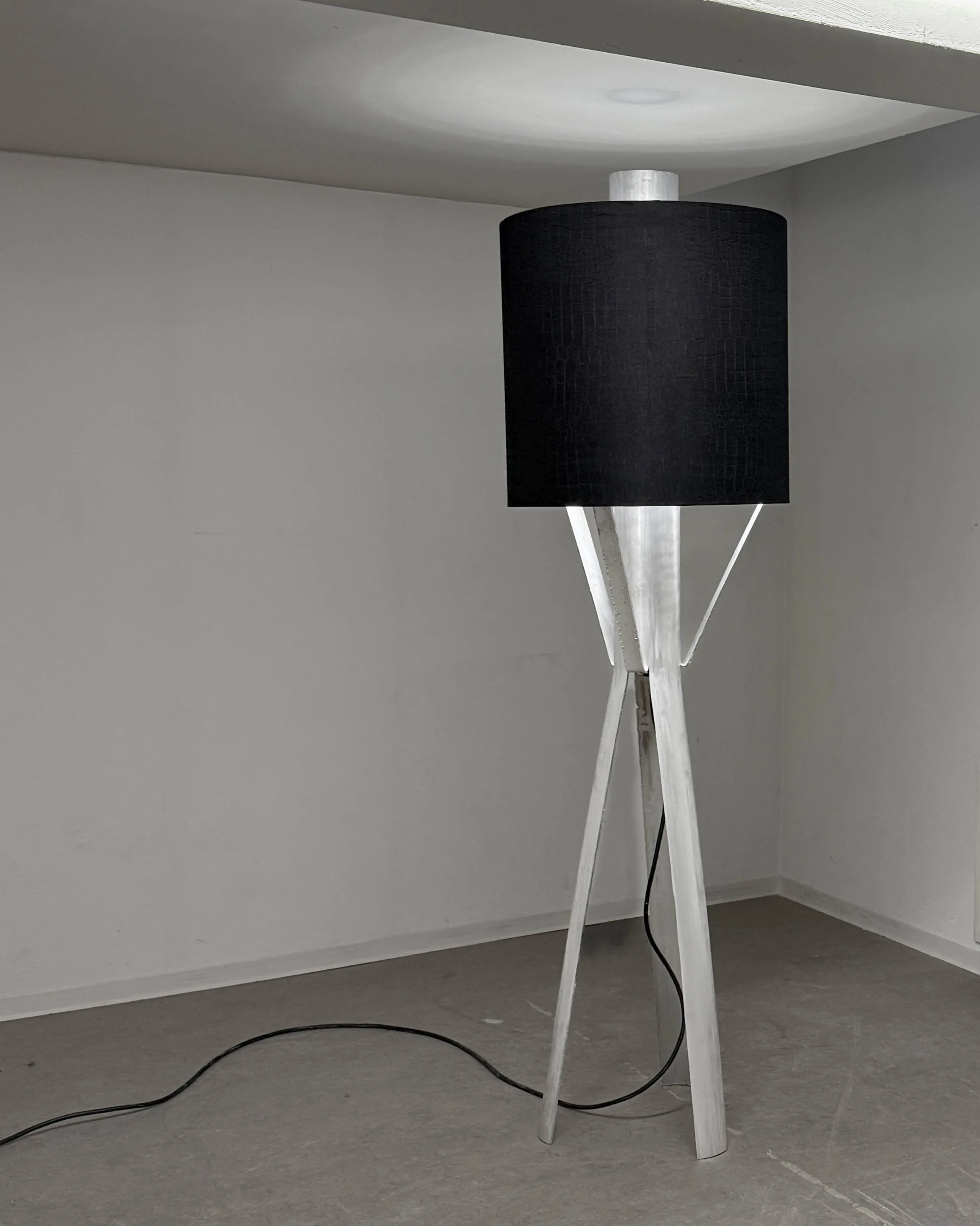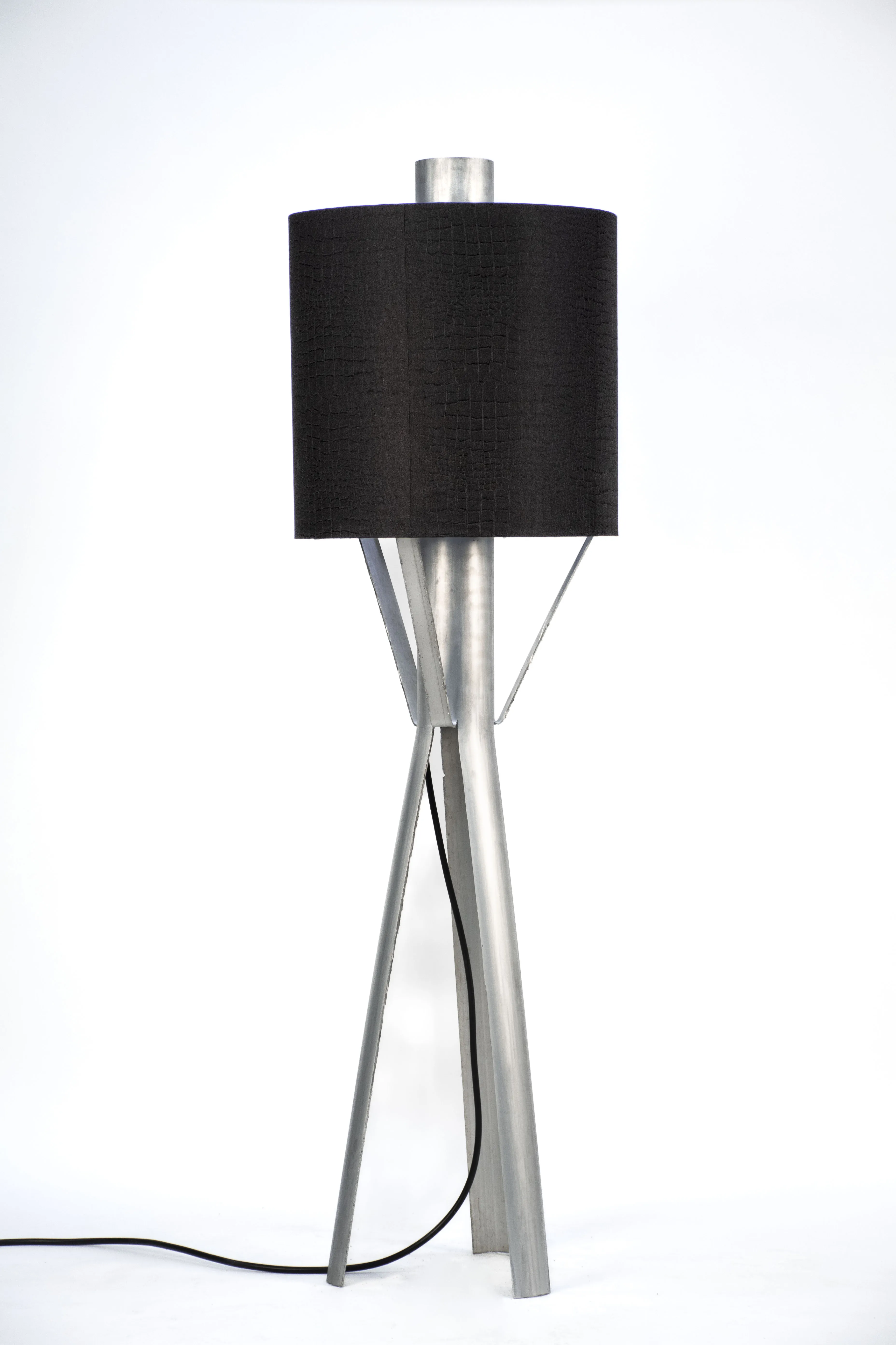 An alligator jacquard lampshade introduces texture and depth, creating a refined contrast with the clean aluminum frame. The patterned surface brings warmth and tactility, enriching the lamp’s simple geometry. By working with one uninterrupted tube, the design turns a structural constraint into an elegant sculptural gesture, uniting precision, texture, and material honesty. Created in collabortion with Max Strick.