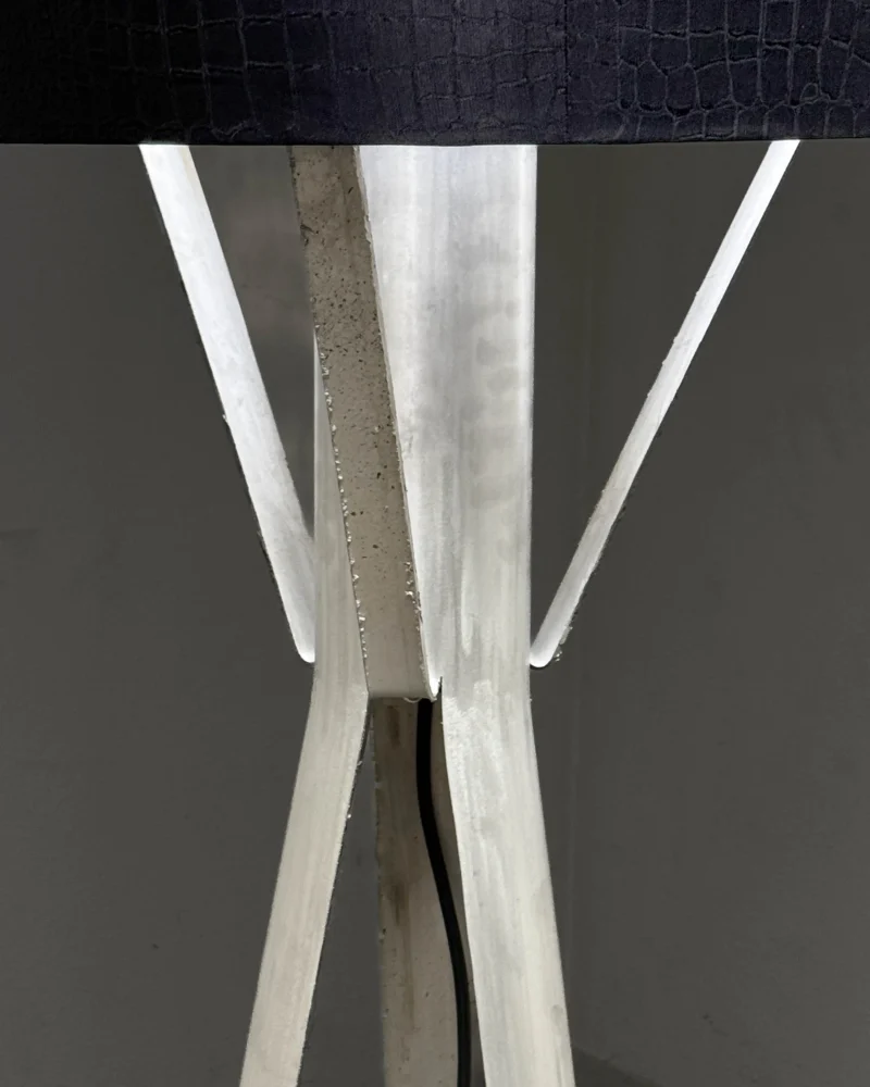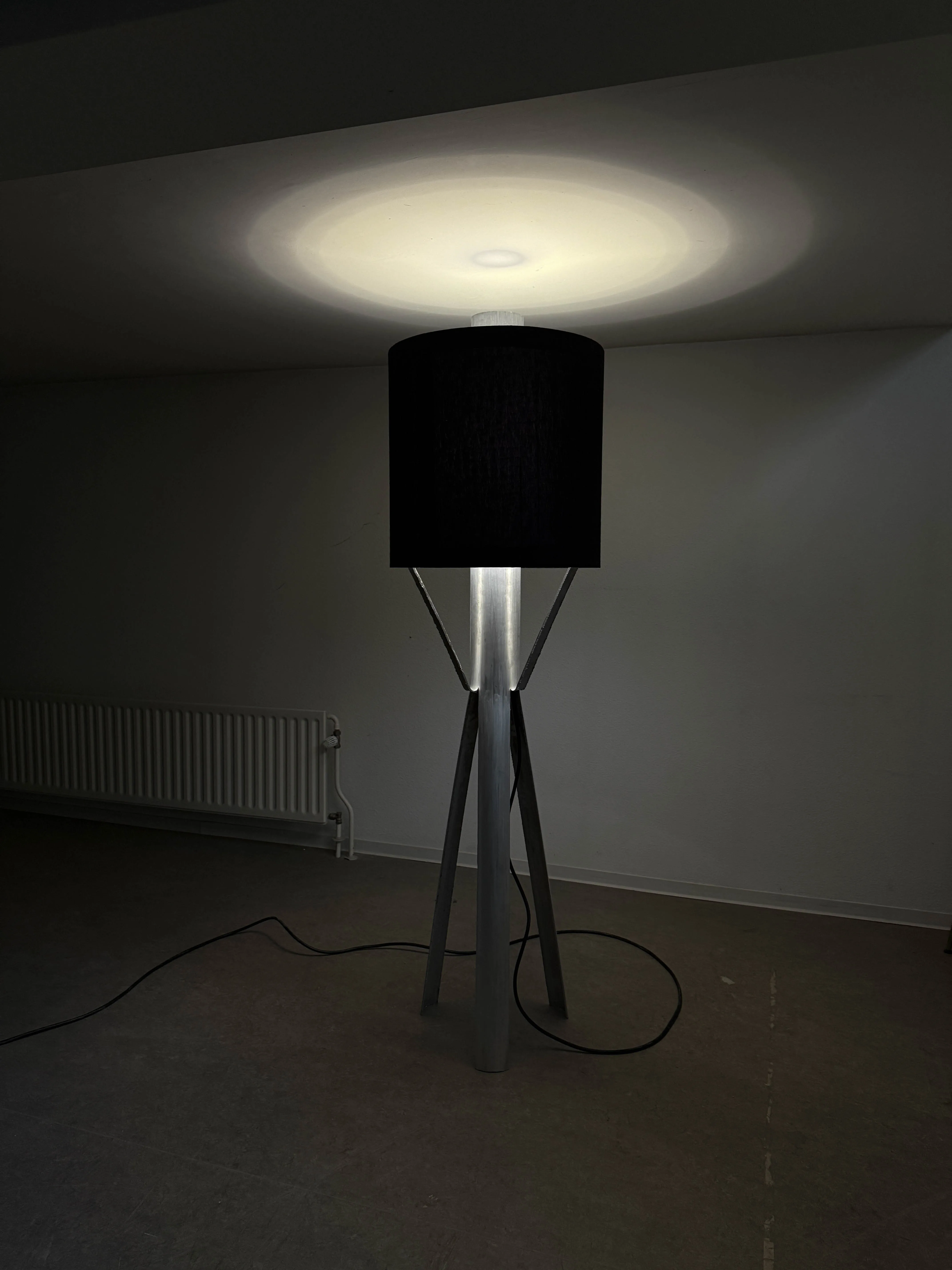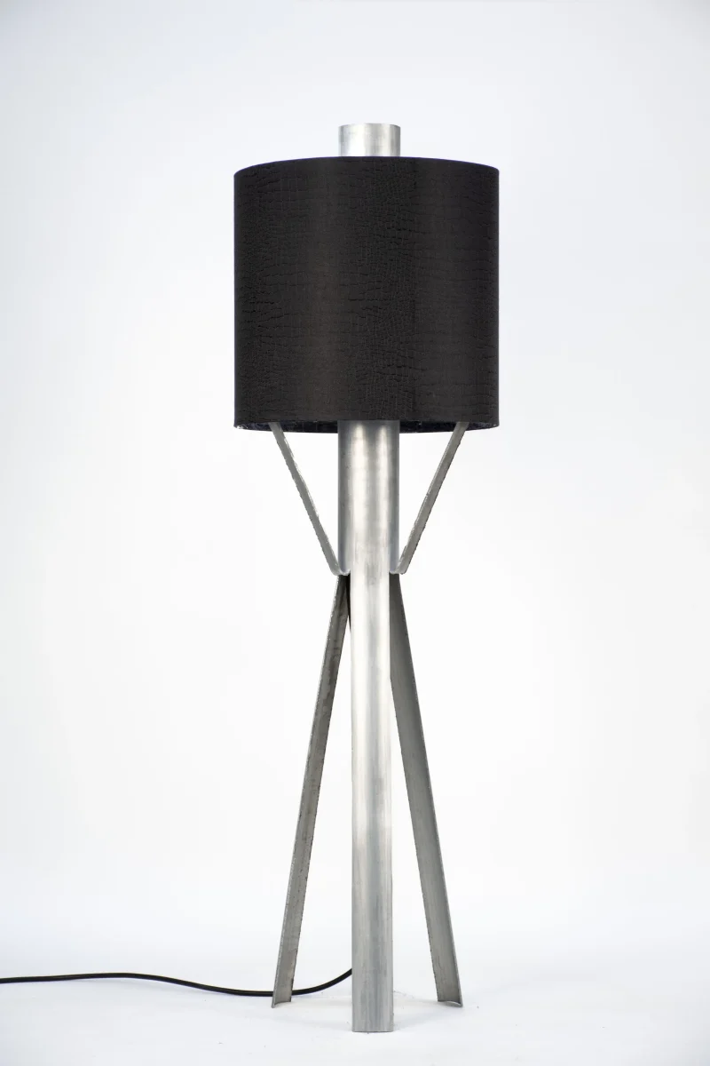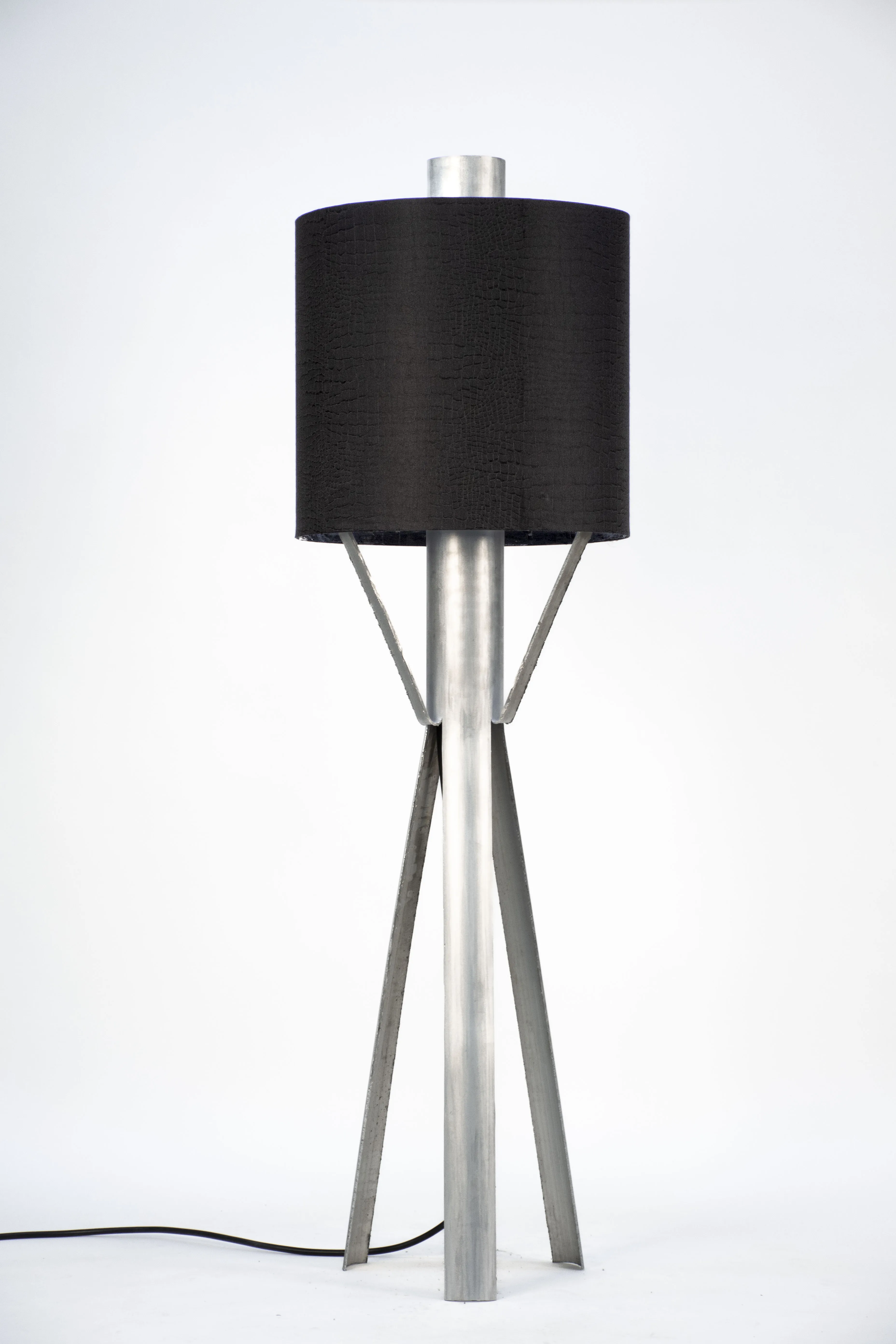 An alligator jacquard lampshade introduces texture and depth, creating a refined contrast with the clean aluminum frame. The patterned surface brings warmth and tactility, enriching the lamp’s simple geometry. By working with one uninterrupted tube, the design turns a structural constraint into an elegant sculptural gesture, uniting precision, texture, and material honesty. Created in collabortion with Max Strick.