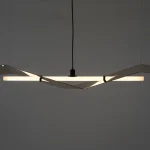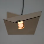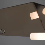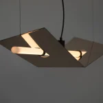 A pendant light formed out of a bronze plate that suggests the simplified shape of a predatory bird.