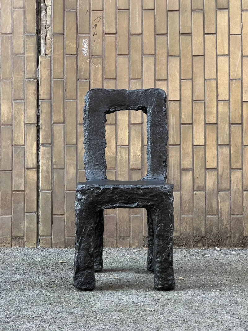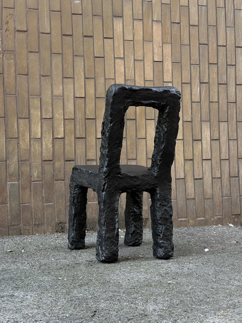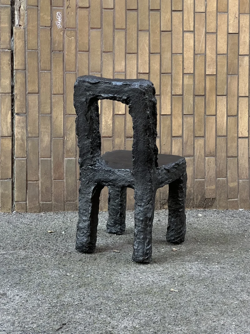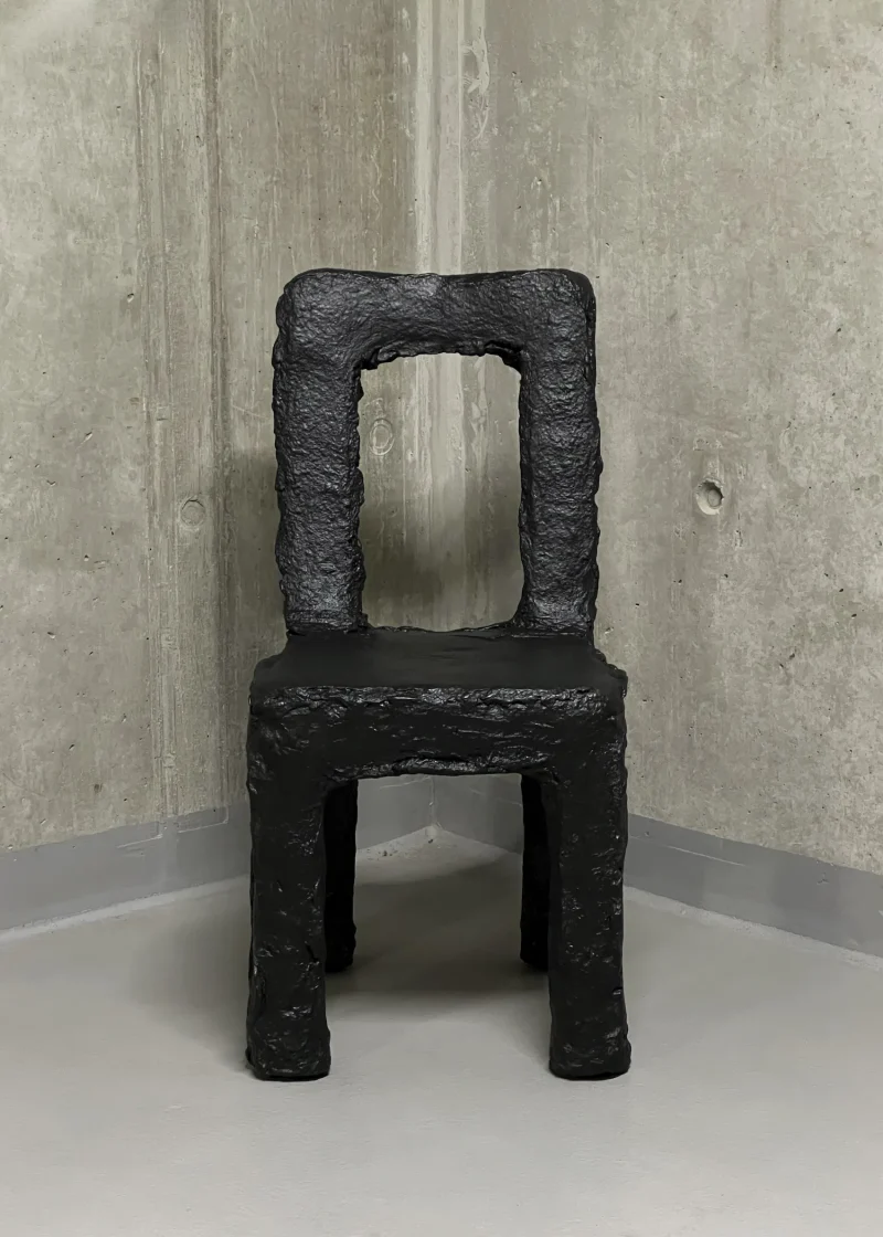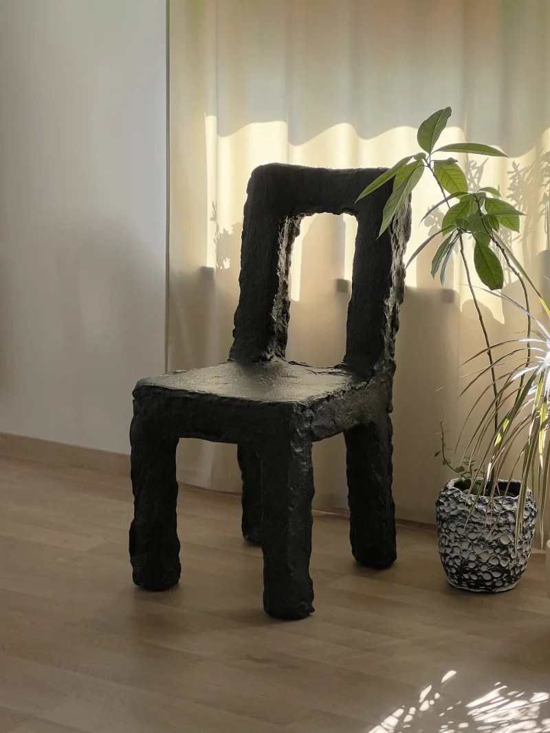 Upcycled, black, fully functional, handmade chair by David Čáp, with a square shape made of shredded paper. Despite the unconventional material, it has sufficient load capacity (100 kg) and is easy to wash.