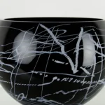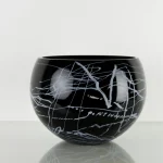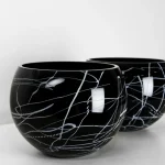 It is made of hand-blown black hyalite glass blown into the mold. Then it’s cut and painted.
