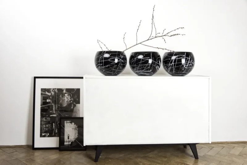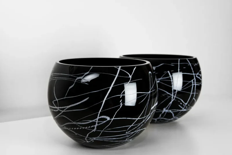 It is made of hand-blown black hyalite glass blown into the mold. Then it’s cut and painted.