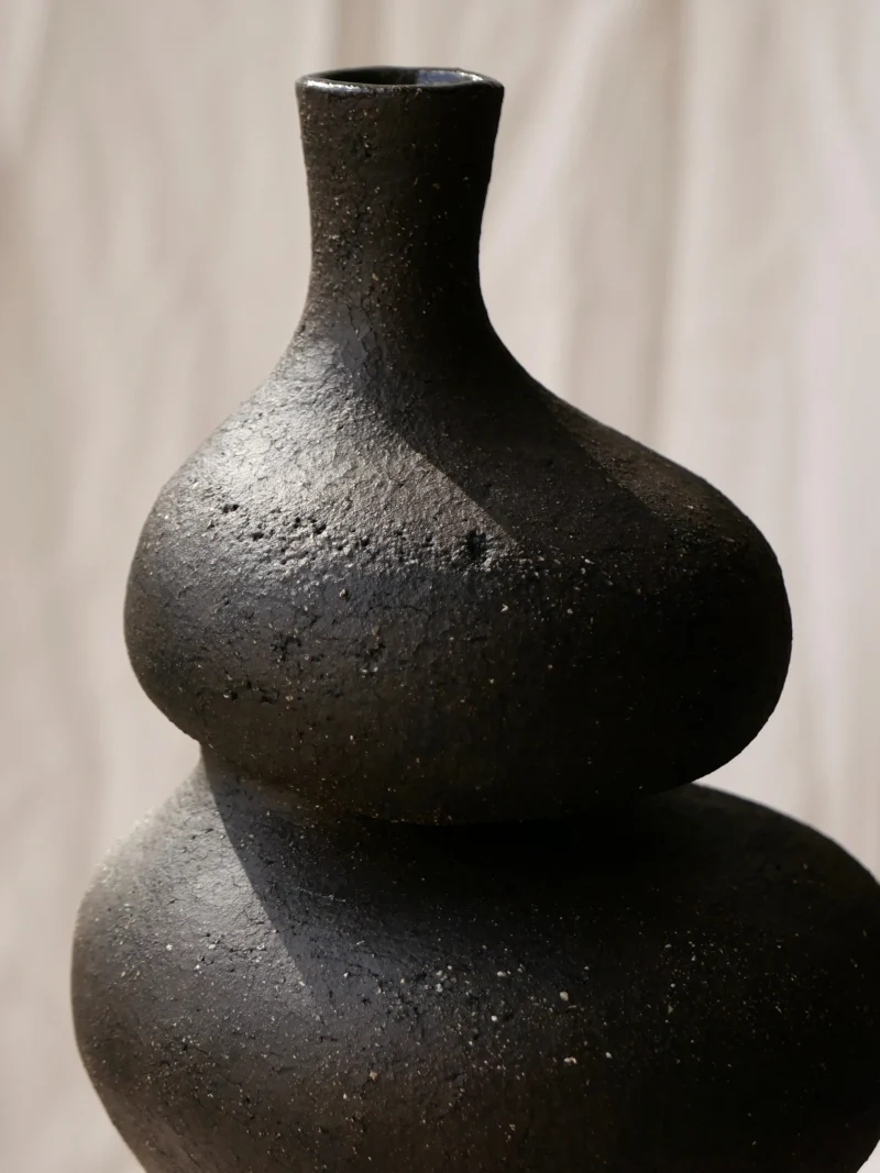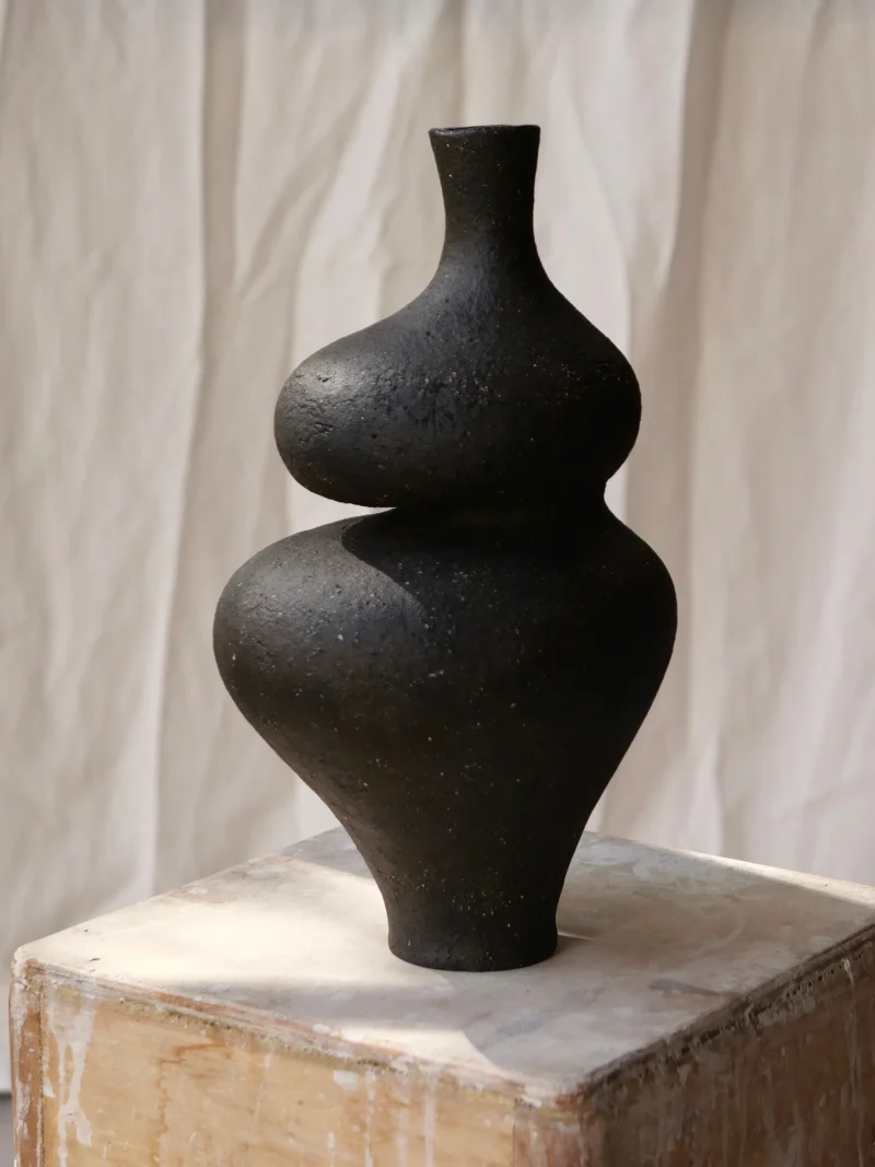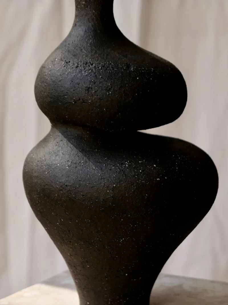 The Black Lilith sculptural vessel is a radically minimalist piece, entirely handcrafted using coiling and sculpting techniques to achieve asymmetrical and generous curves.
