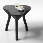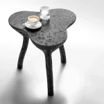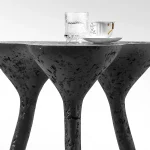 The material’s slight elasticity sets it apart, offering resilience and durability. Unlike rigid materials, it flexes under pressure, avoiding issues like splitting or crumbling. This distinctive composition ensures a lasting aesthetic appeal, with the tables maintaining their original color and texture over time. A perfect blend of form, function, and innovation, these tables redefine the boundaries of traditional materials in contemporary design.
